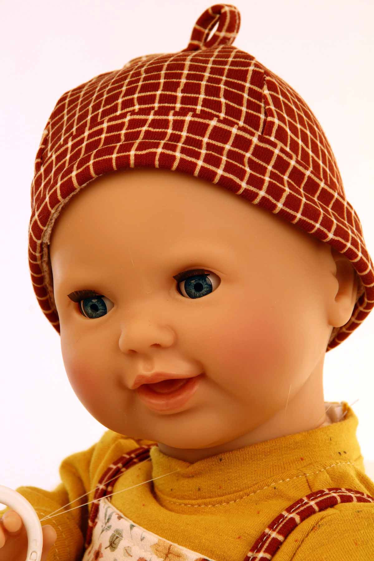 Schnullerbaby Lenchen 37 cm, Malhaar, blaue Schlafaugen, Blumenhose, Shirt und Karomütze