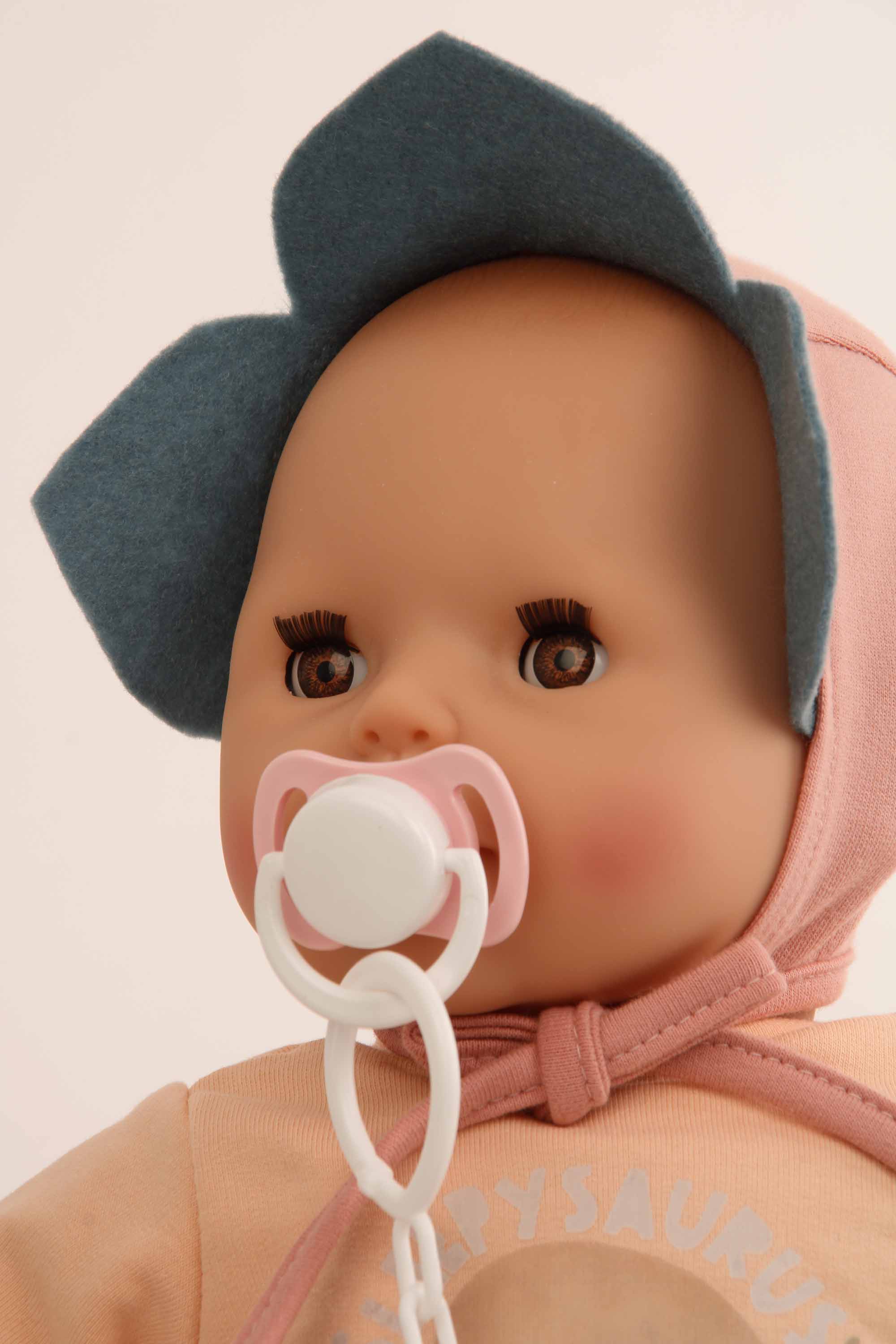 Produktinformationen "Baby Amy 45 cm mit Schnuller, Malhaar, braune Schlafaugen, Dino-Kleidung"