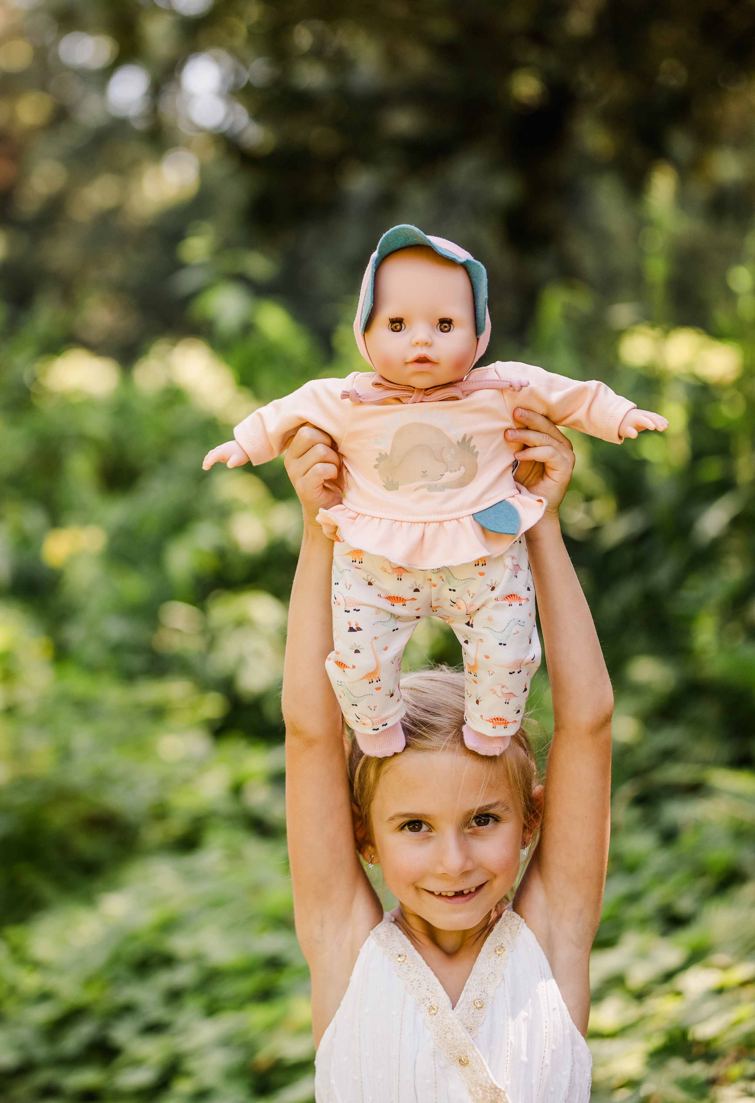 Die Kleidung besteht aus Hose mit Dinos bedruckt, einer apricotfarbigen Tumika mit Dino-Print und einem passenden rose Hut. Die Schnuller 0001017 und Windeln 0001034 und rosa Strümpfe (0045174 )können extra dazu bestellt werden. Die Kleidung wird komplett in Handarbeit in unserer Puppenmanufaktur in Rauenstein /Thüringen gefertigt. Diese Kleidung kann per Hand bei 30 Grad gewaschen werden. Die Puppe gehört nicht zum Lieferumfang. Achtung: nicht geeignet für Kinder unter 36 Monate, da Kleinteile sich lösen und verschluckt werden können.