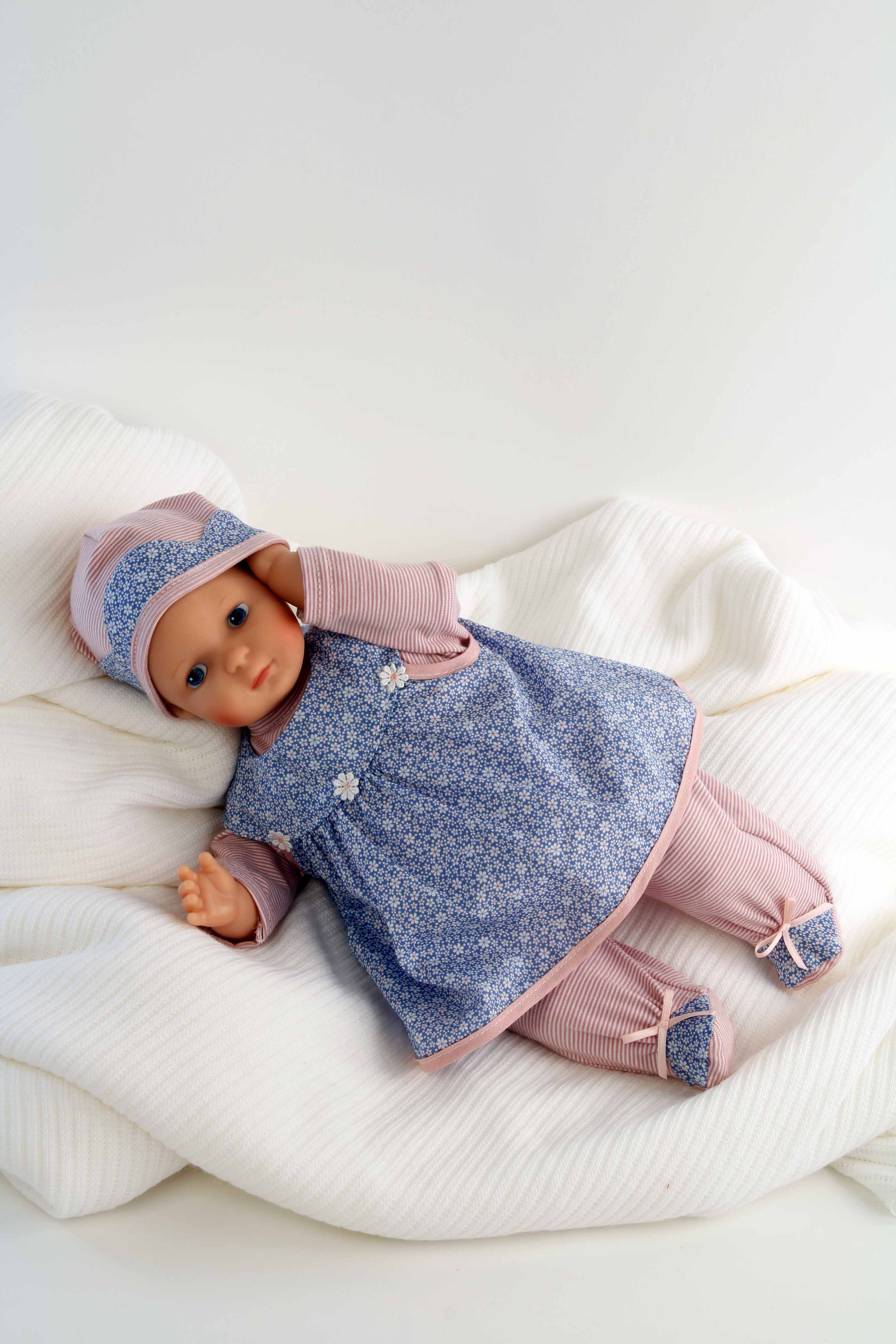 Kleidung bestehend aus einem weißen Overall mit Segelbooten bedruckt, einem blauen Shirt und passender Mütze.Die Strümpfe 0041175 können separat dazu bestellt werden. Die Kleidung wird komplett in Handarbeit in unserer Puppenmanufaktur in Rauenstein /Thüringen gefertigt. Diese Kleidung kann per Hand bei 30 Grad gewaschen werden. Achtung: nicht geeignet für Kinder unter 36 Monate, da Kleinteile sich lösen können und verschluckt werden können.