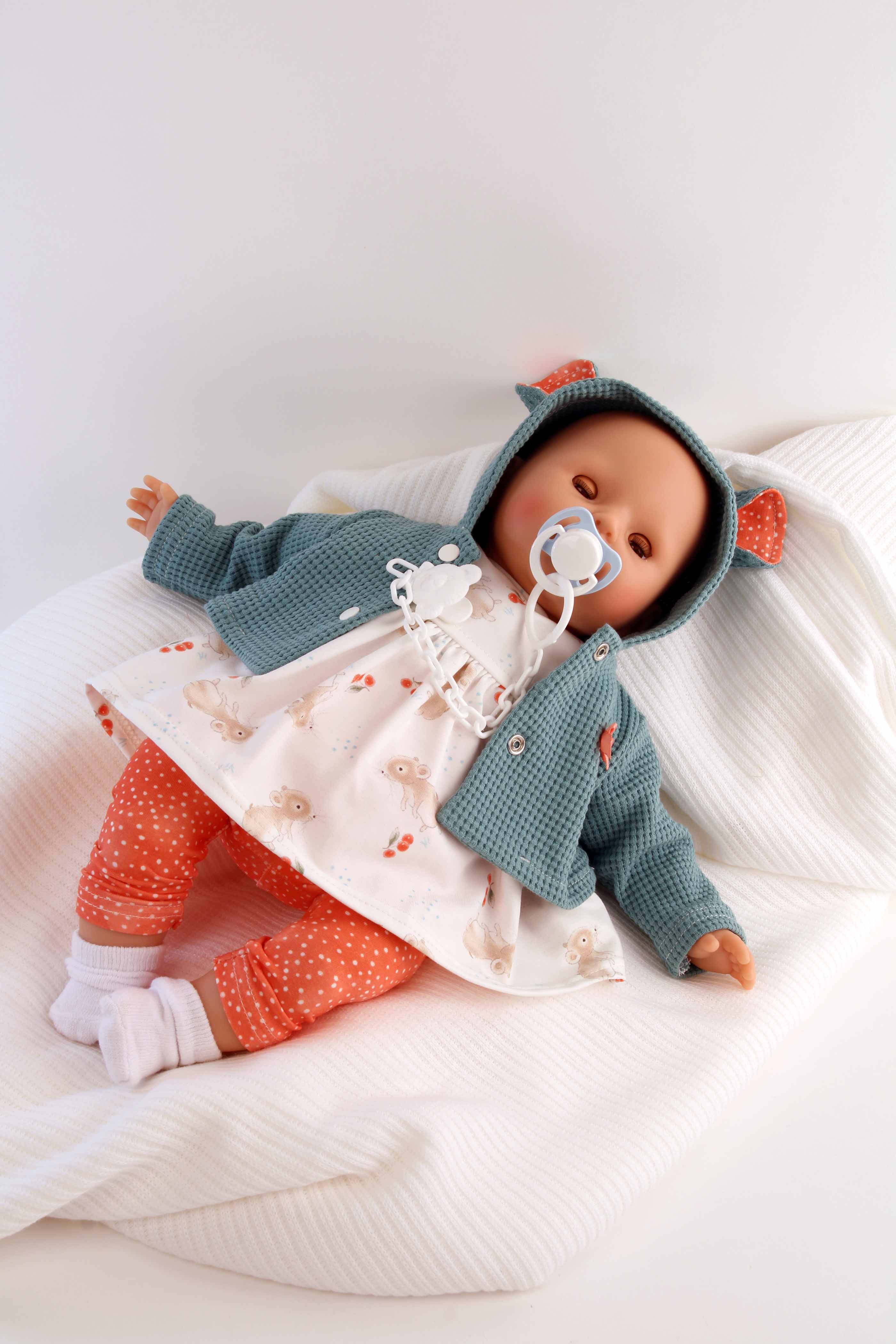 Die Kleidung besteht aus einer organgen Hose mit Fuchsprint, einem orangen Pulli mit Fuchsprint und einer passenden orangen Mütze Die Schnuller 0001017 können extra dazu bestellt werden.Die Puppe gehört nicht zum Lieferumfang. Die Kleidung wird komplett in Handarbeit in unserer Puppenmanufaktur in Rauenstein /Thüringen gefertigt. Diese Kleidung kann per Hand bei 30 Grad gewaschen werden. Achtung: nicht geeignet für Kinder unter 36 Monate, da Kleinteile sich lösen und verschluckt werden können.