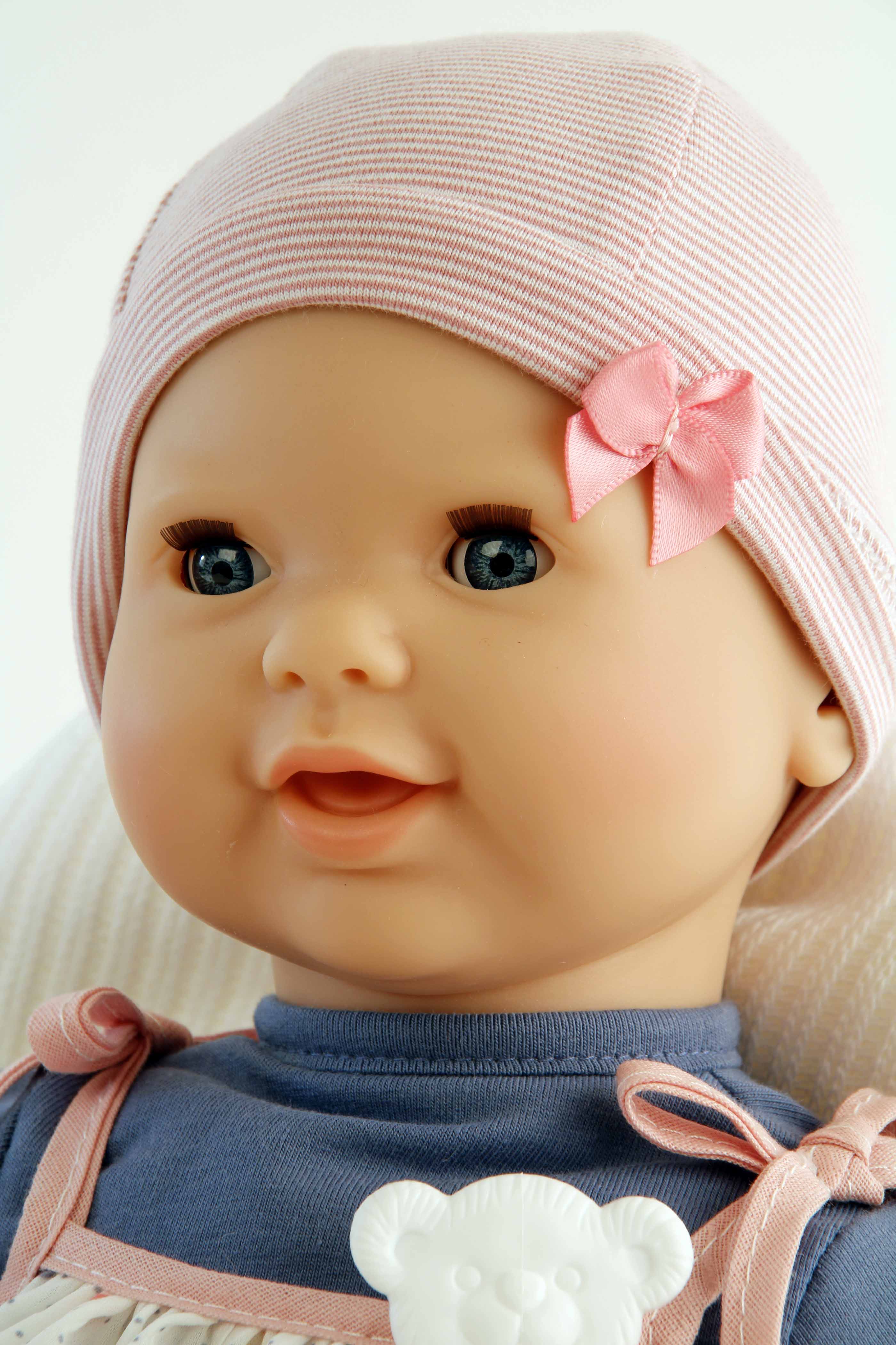Schnullerbaby Lenchen 37 cm, Malhaar, blaue Schlafaugen, Kleidung blau/weiss/rose