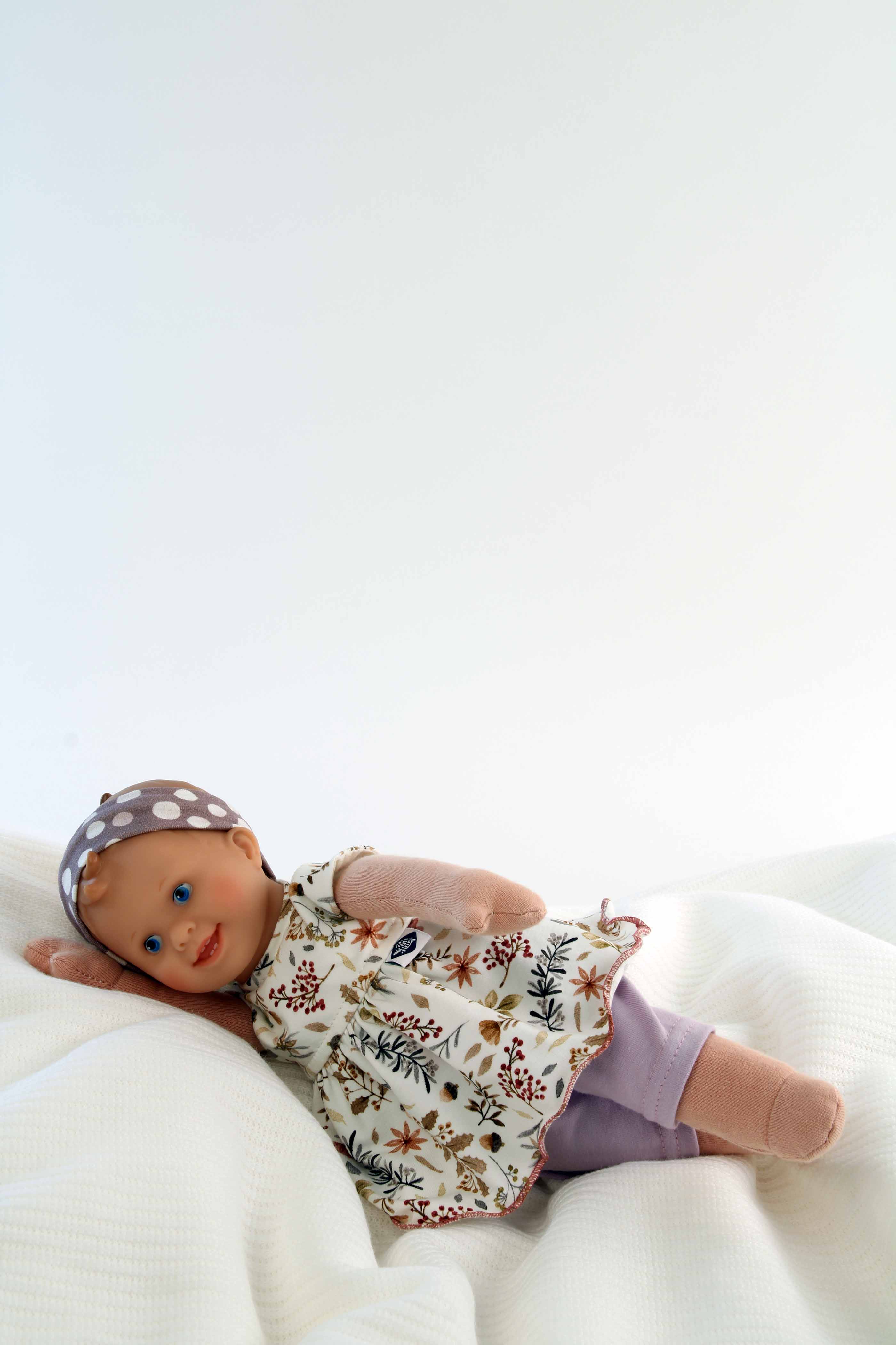 Kleidung bestehend aus einer knielangen rostroten Strickhose, einer mit Pilzen und Schnecken bedruckten Tunika und einem passenden Stirnband. Die Kleidung ist bei 30 Grad per Hand waschbar. Diese Kleidung paßt auch unserer Puppe Mein 1. Baby Gr. 28. und dem Löckchen Gr. 30 Diese Kleidung wurde komplett in Handarbeit in unserer Puppenmanufaktur in Rauenstein/Thüringen gefertigt.Die Puppe gehört nicht zum Lieferumfang.