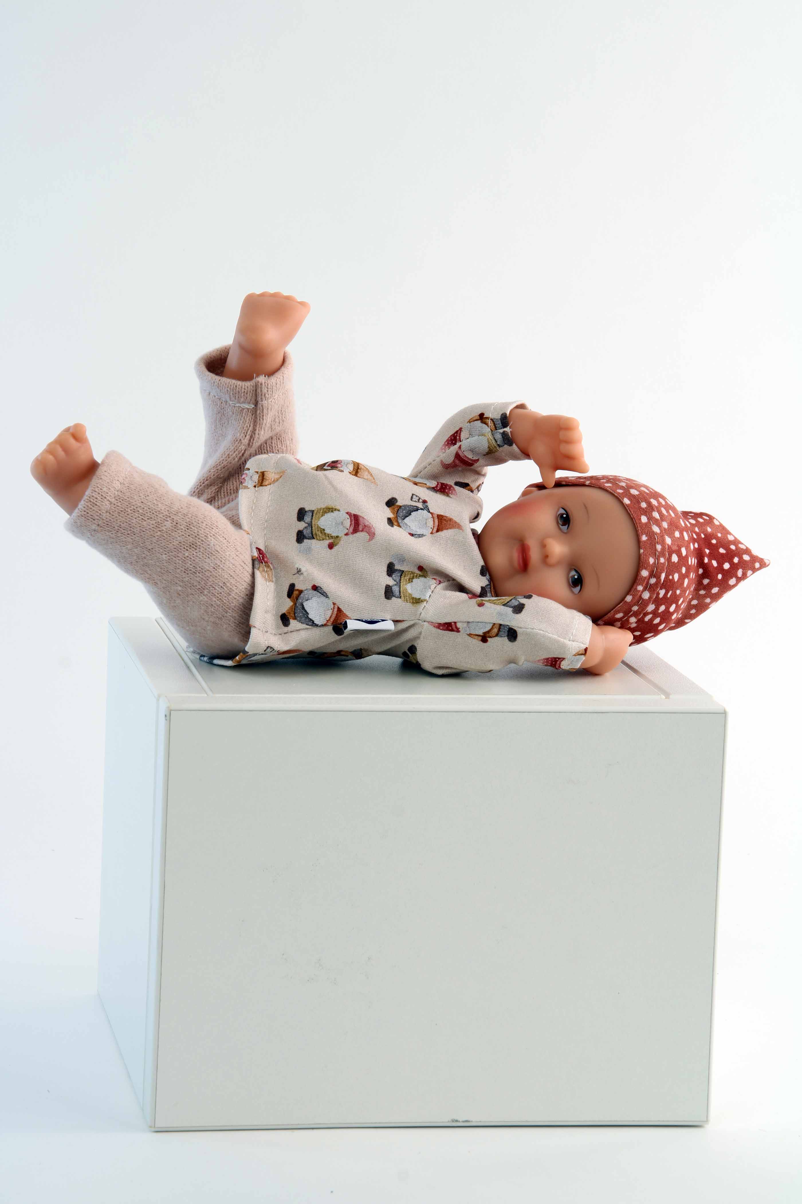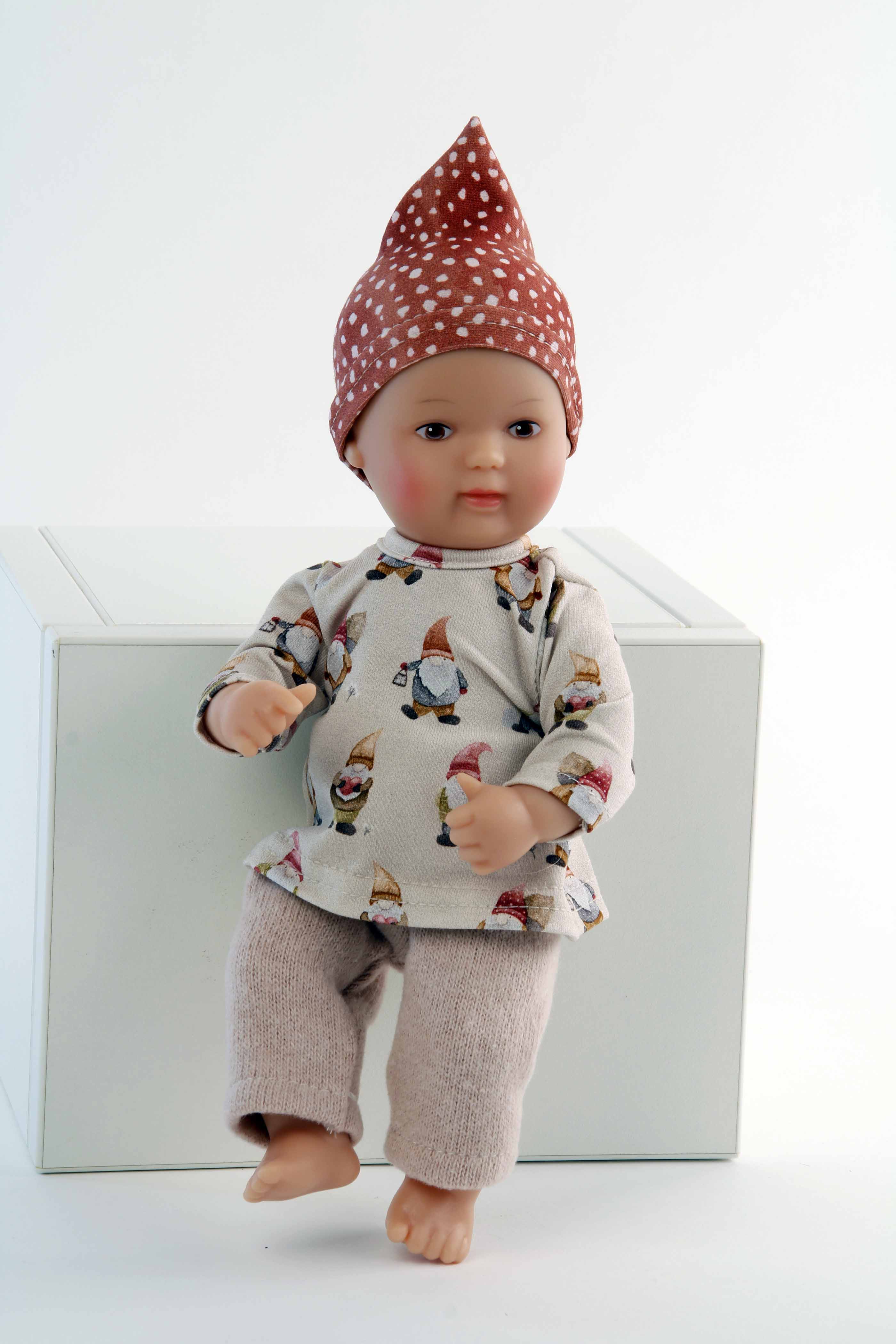 lustige Spielkleidung bestehend aus einer rose Hose, einer Shirt mit Zwergen bedruckt und einer rotbraun getupften Zipfelmütze. Die Kleidung ist bei 30 Grad per Hand waschbar. Die Kleidung wird komplett in Handarbeit in unserer Puppenmanufaktur in Rauenstein /Thüringen gefertigt. Diese Kleidung paßt auch unserem Schmuserle und Löckchen Gr. 30. Die Puppe gehört nicht zum Lieferumfang.