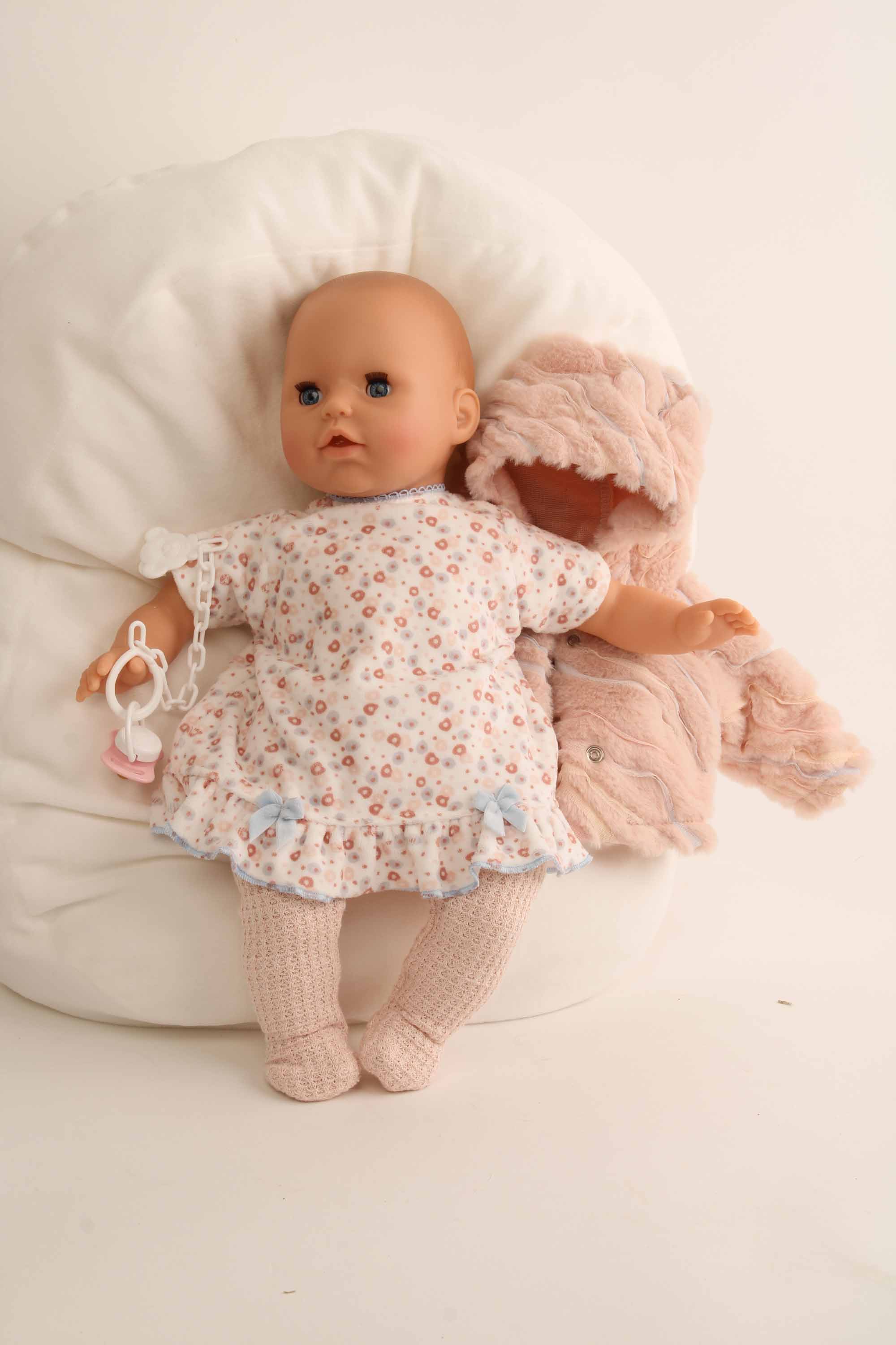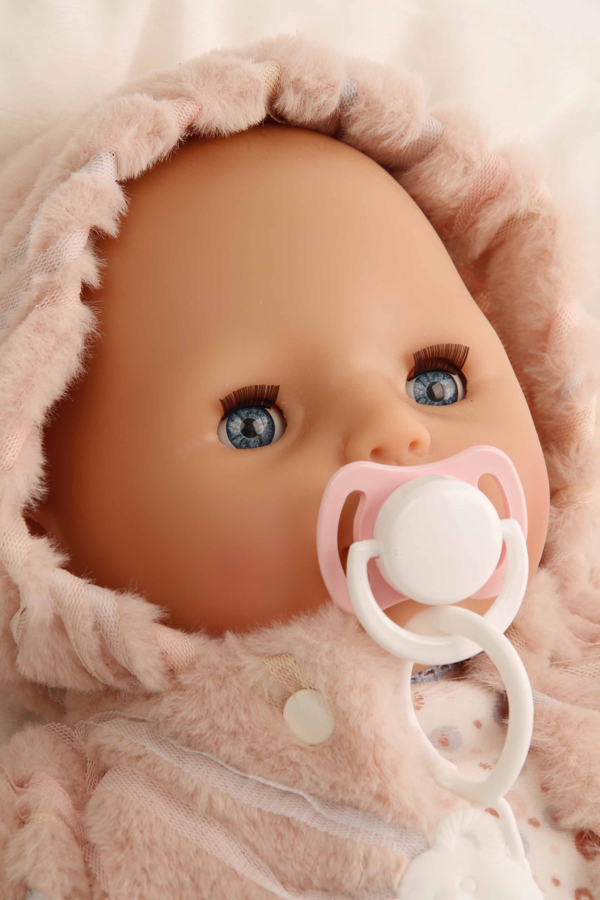 Baby Amy 45 cm mit Schnuller, Malhaar, blaue Schlafaugen, Babykleidung rose