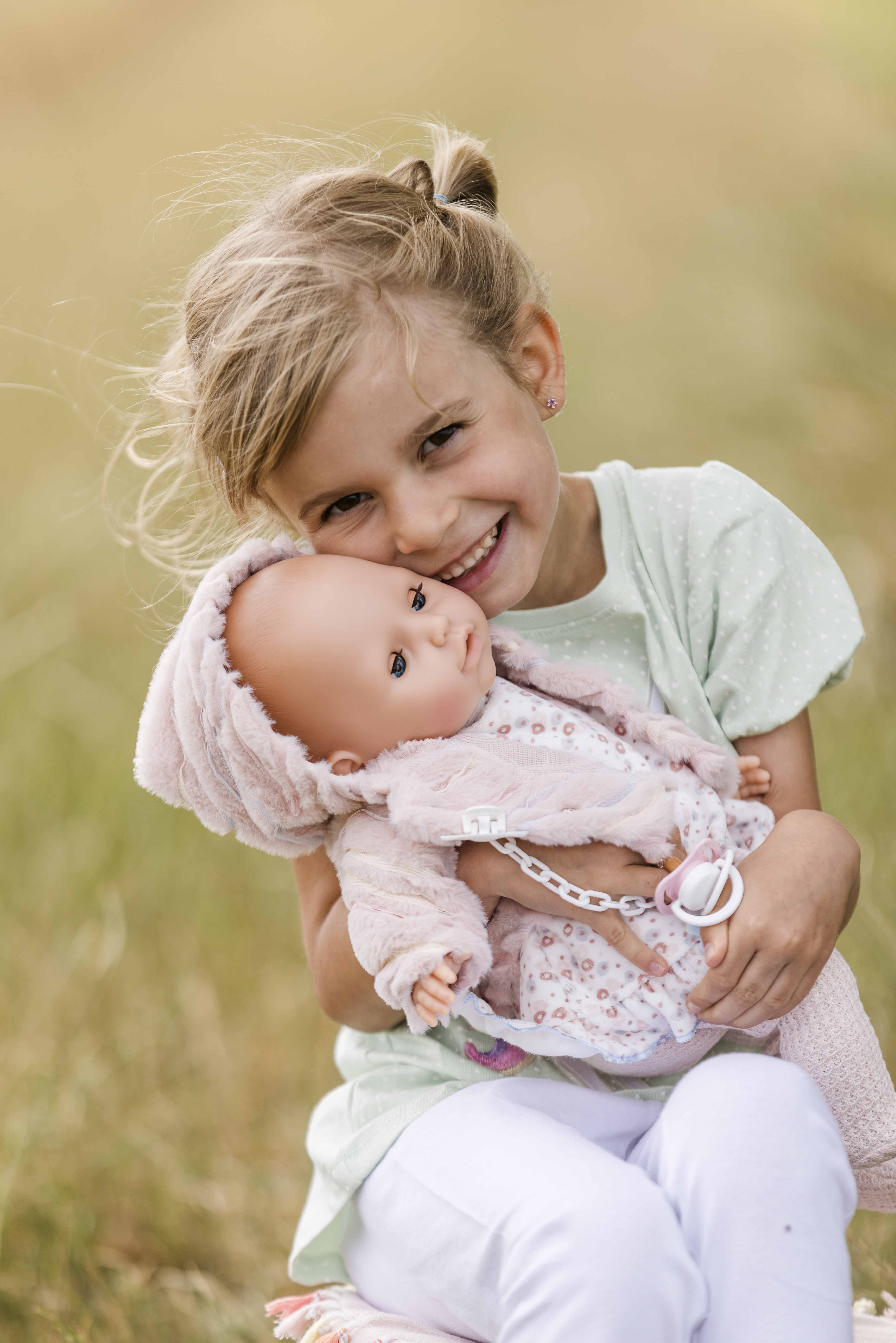 Amy verzaubert Groß und Klein mit ihrem liebevollen Babygesicht und ihrem Lächeln. Diese bezaubernde Puppe kommt mit einer praktischen Windel zum Wechseln und einem Schnuller, sodass Ihr Kind sie liebevoll umsorgen kann. Ihr weicher Stoffkörper lädt zum Knuddeln und Schmusen ein und sorgt für unvergessliche Spielmomente. Modelliert von der renommierten Puppenkünstlerin Brigitte Paetsch, besteht Amys Kopf, sowie ihre Arme und Beine aus hochwertigem Vinyl. Dank des Granulatsäckchens im Po kann die Puppe gut sitzen und ist bereit für alle Abenteuer, die Ihr Kind sich ausdenkt.