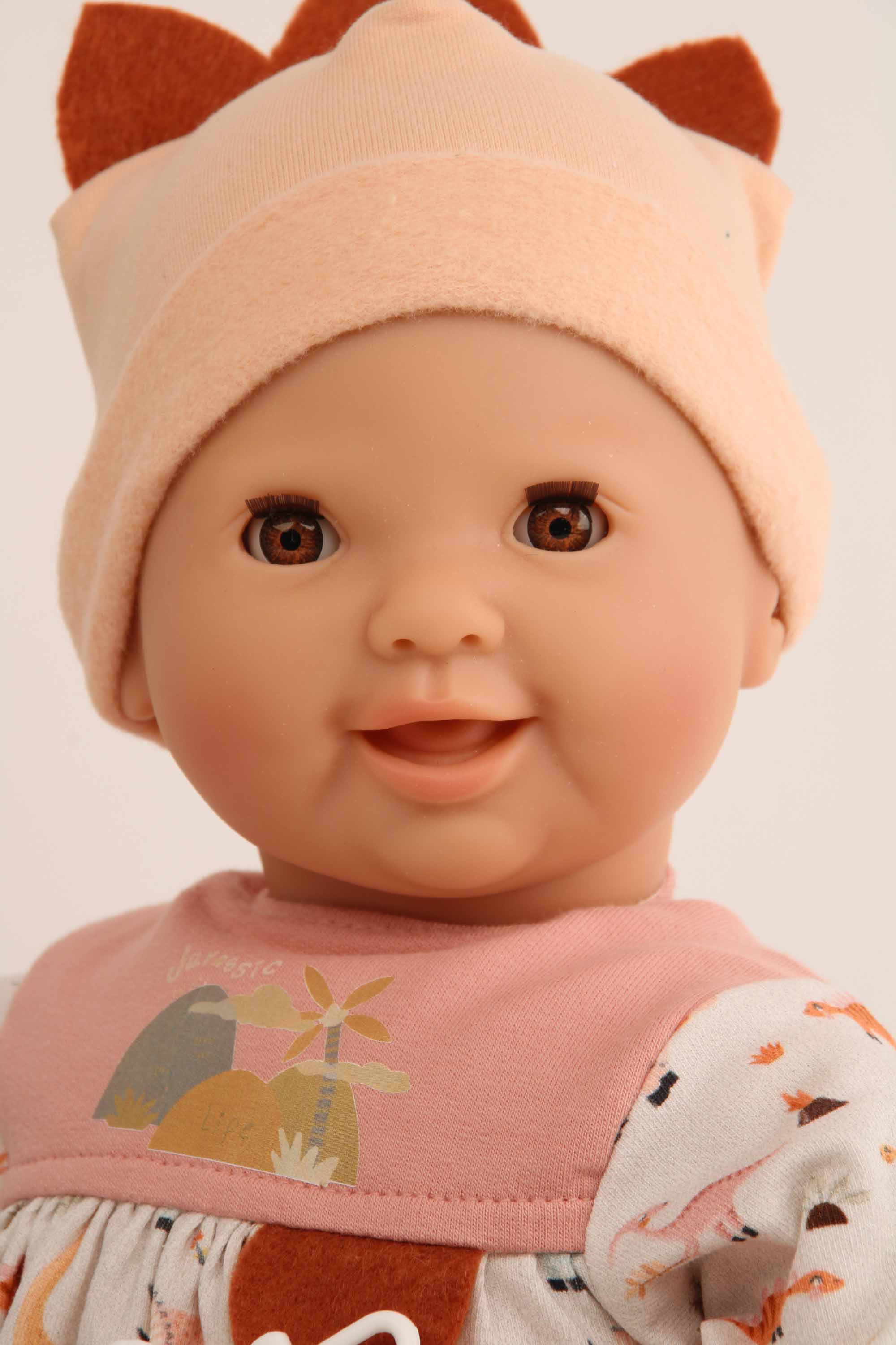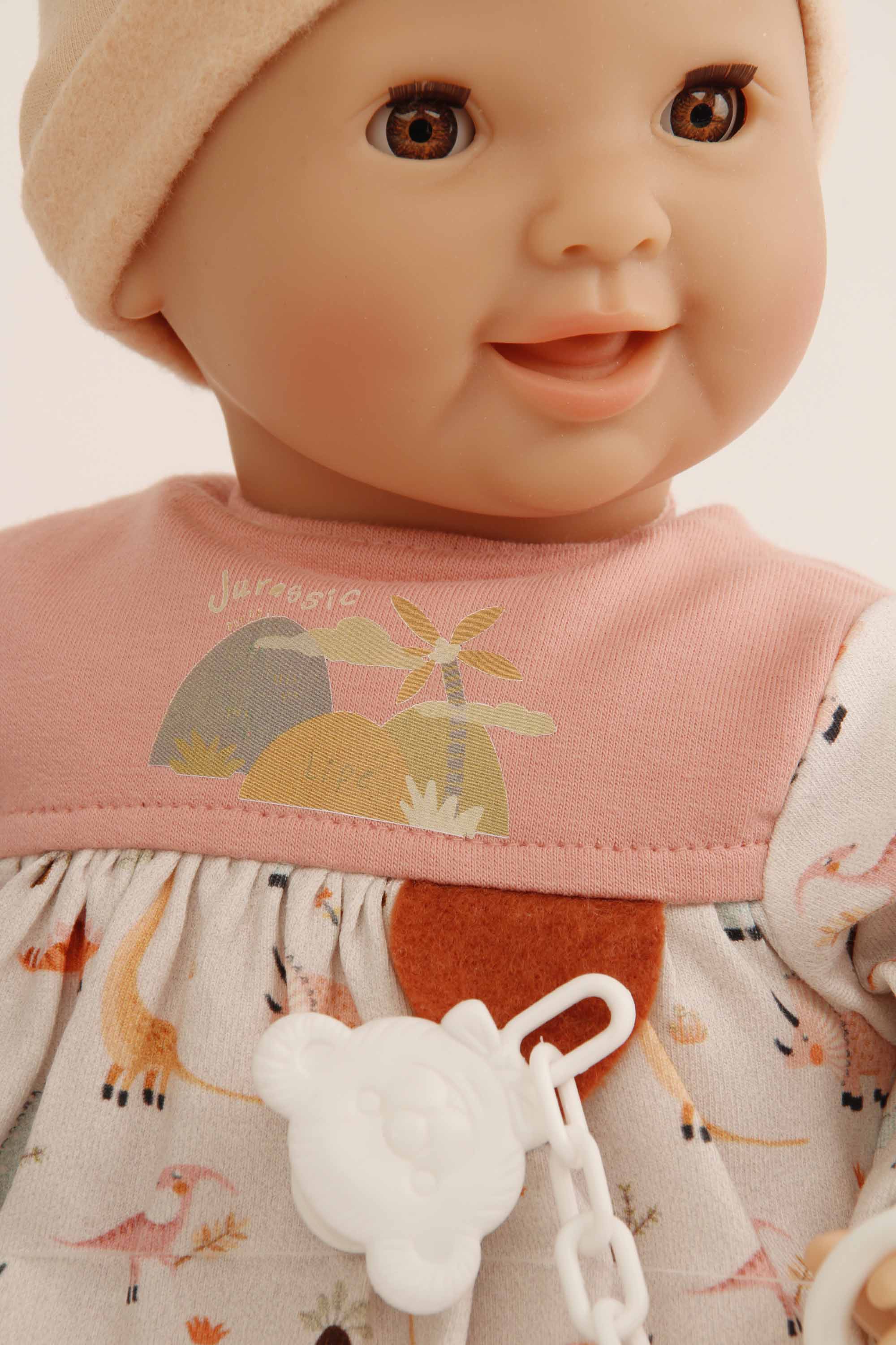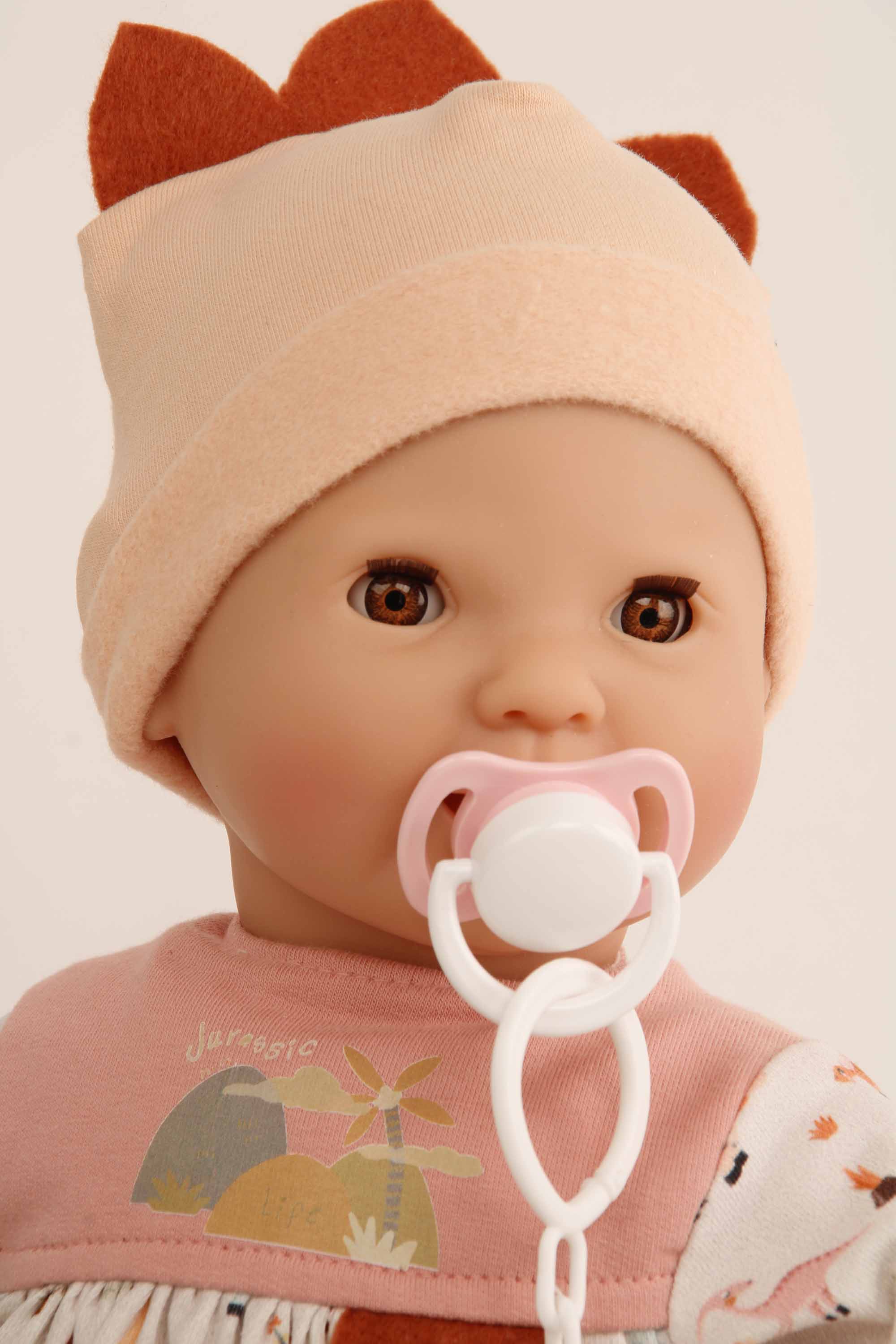 Schnullerbaby Lenchen 37 cm, Malhaar, braune Schlafaugen, Kleidung Dino