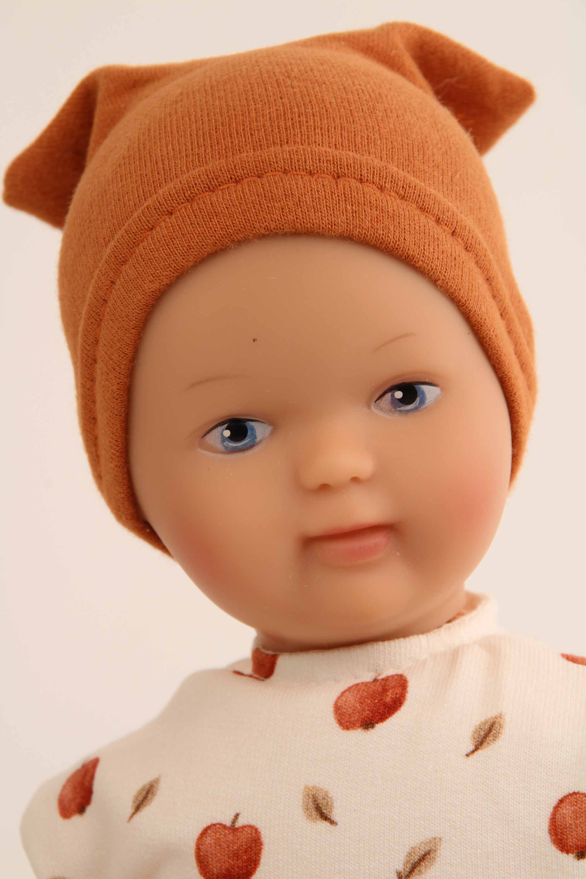 Puppe Schmuserle 30 cm Malhaar, blaue Malaugen, Kleidung Äpfelchen