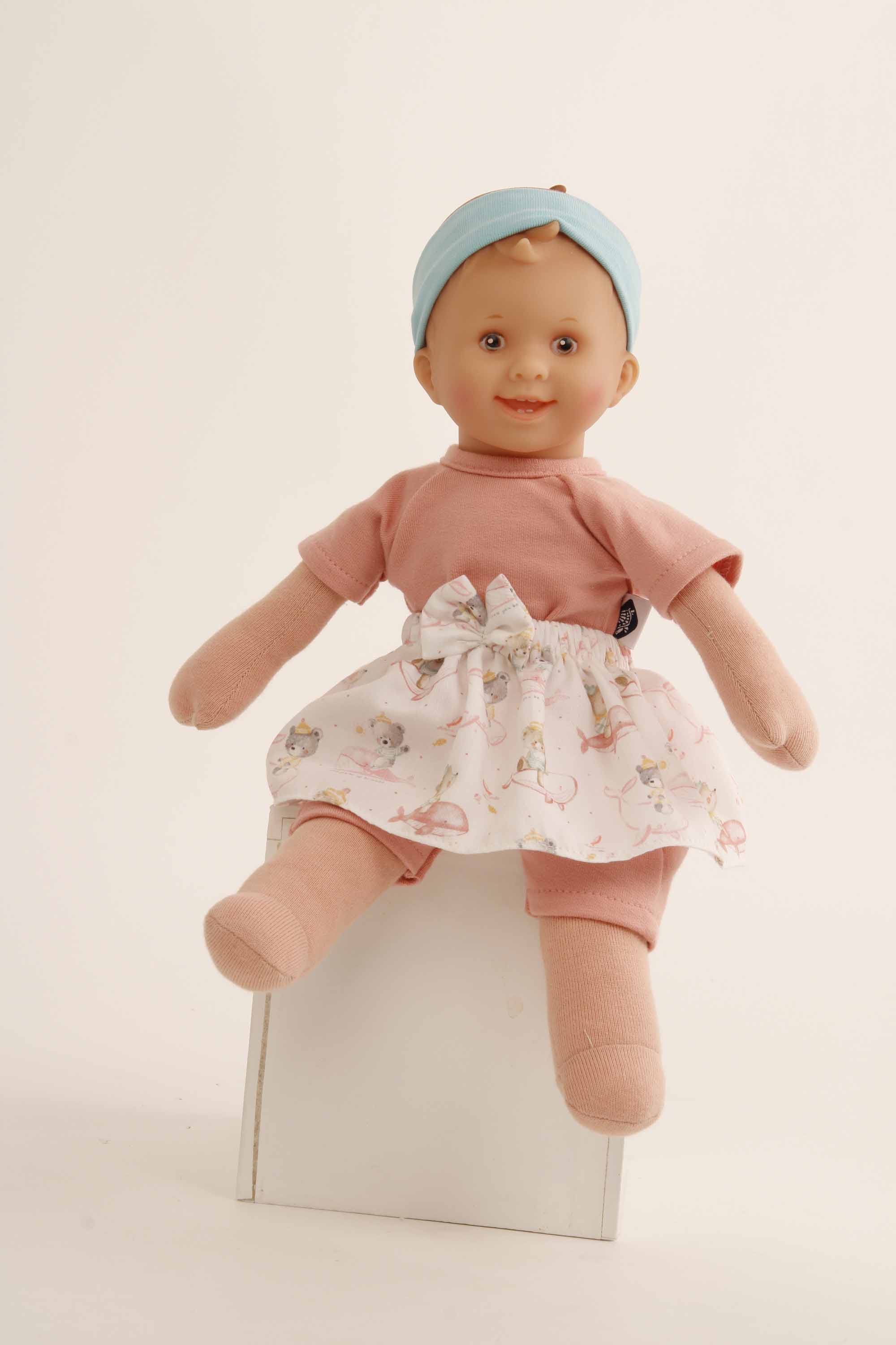 Kleidung bestehend aus einem aprikotfarbigen Overall, darüber ein Rock mit Bärchendruck und einem türkisfarbigen Stirnband. Die Kleidung ist bei 30 Grad per Hand waschbar. Diese Kleidung paßt auch unserer Puppe Mein 1. Baby Gr. 28. und dem Schmuserle Gr. 30 Diese Kleidung wurde komplett in Handarbeit in unserer Puppenmanufaktur in Rauenstein/Thüringen gefertigt.Die Puppe gehört nicht zum Lieferumfang.