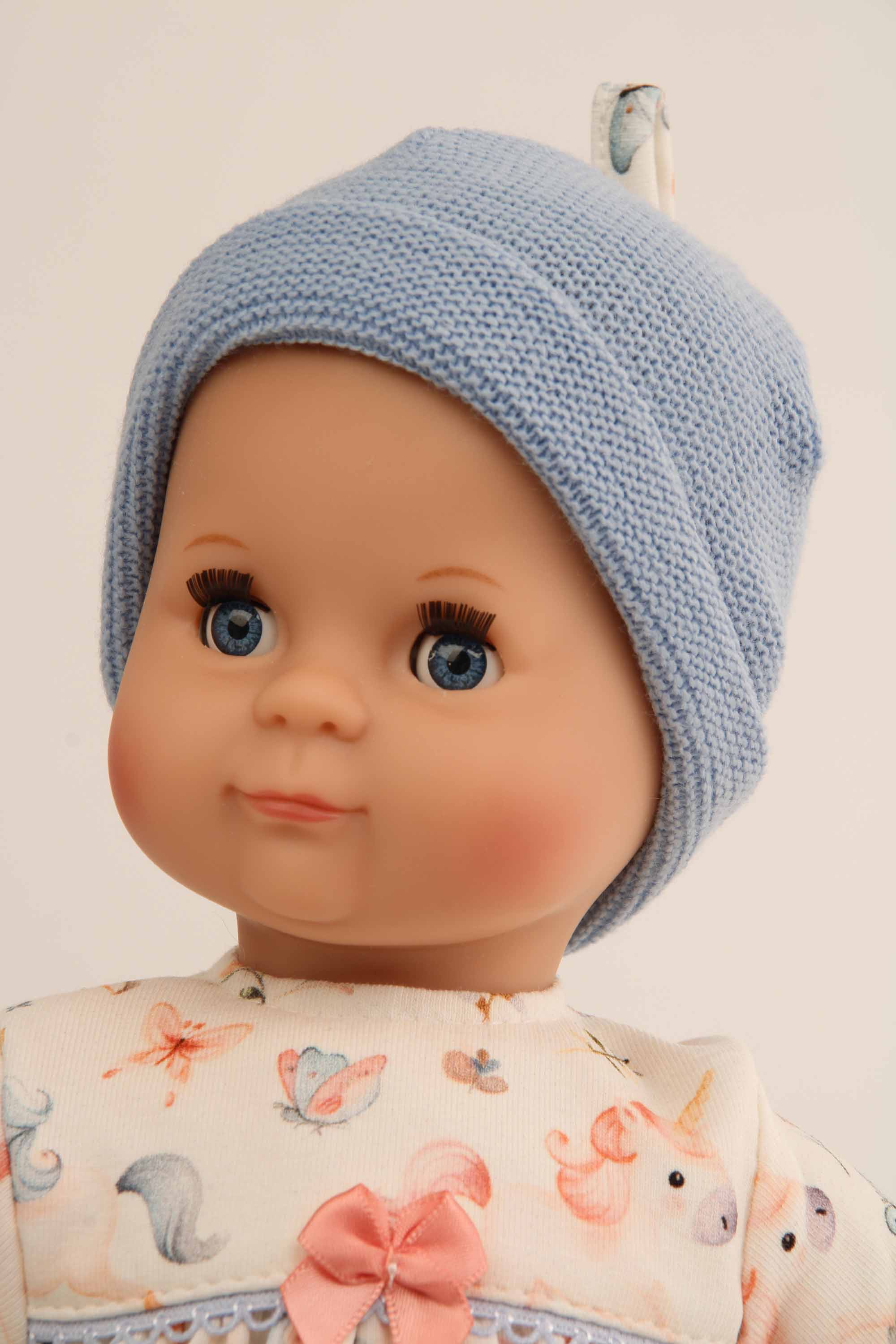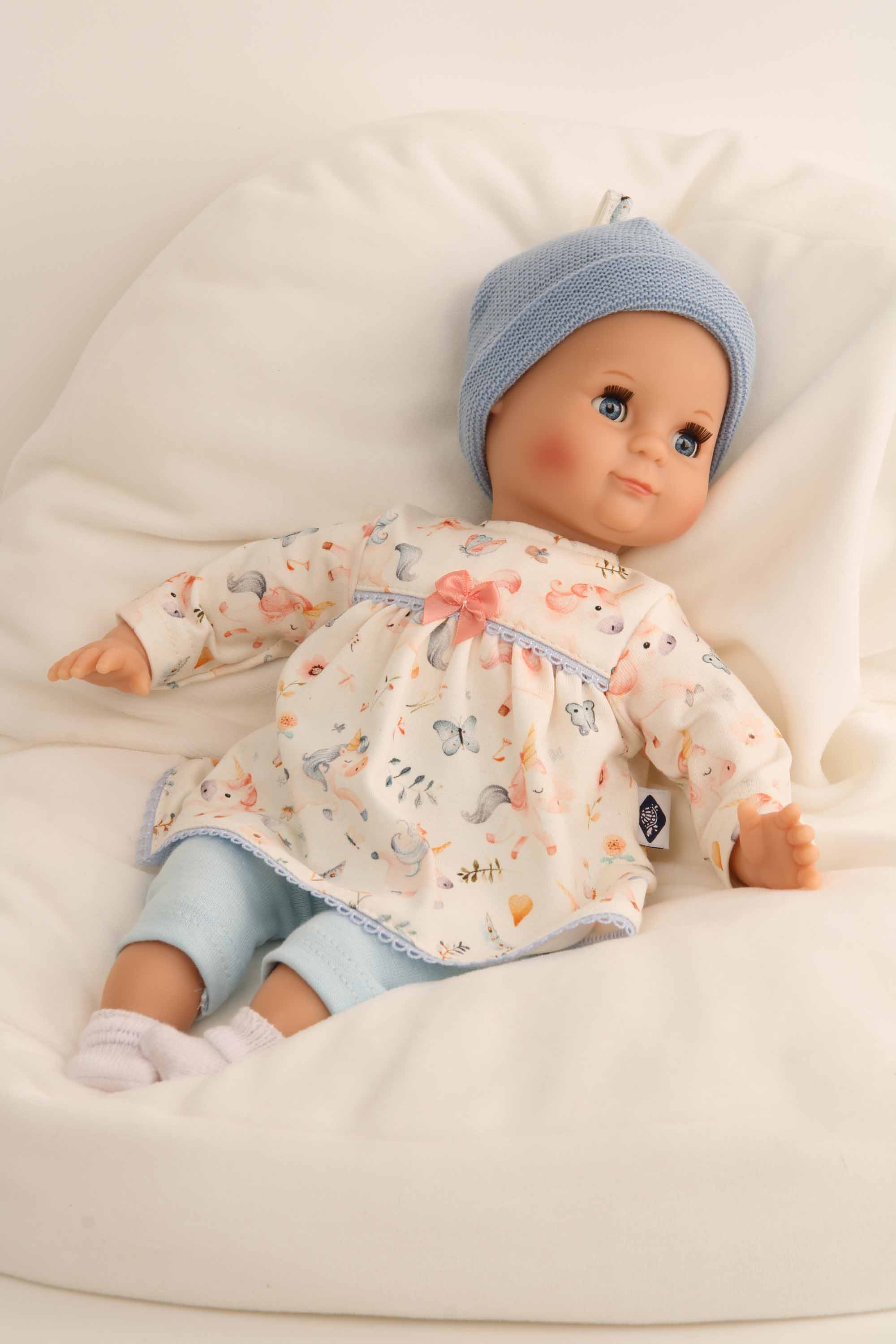 Puppe Schlummerle 32 cm mit Malhaar und blauen Schlafaugen, Kleidung Einhorn blau/weiss