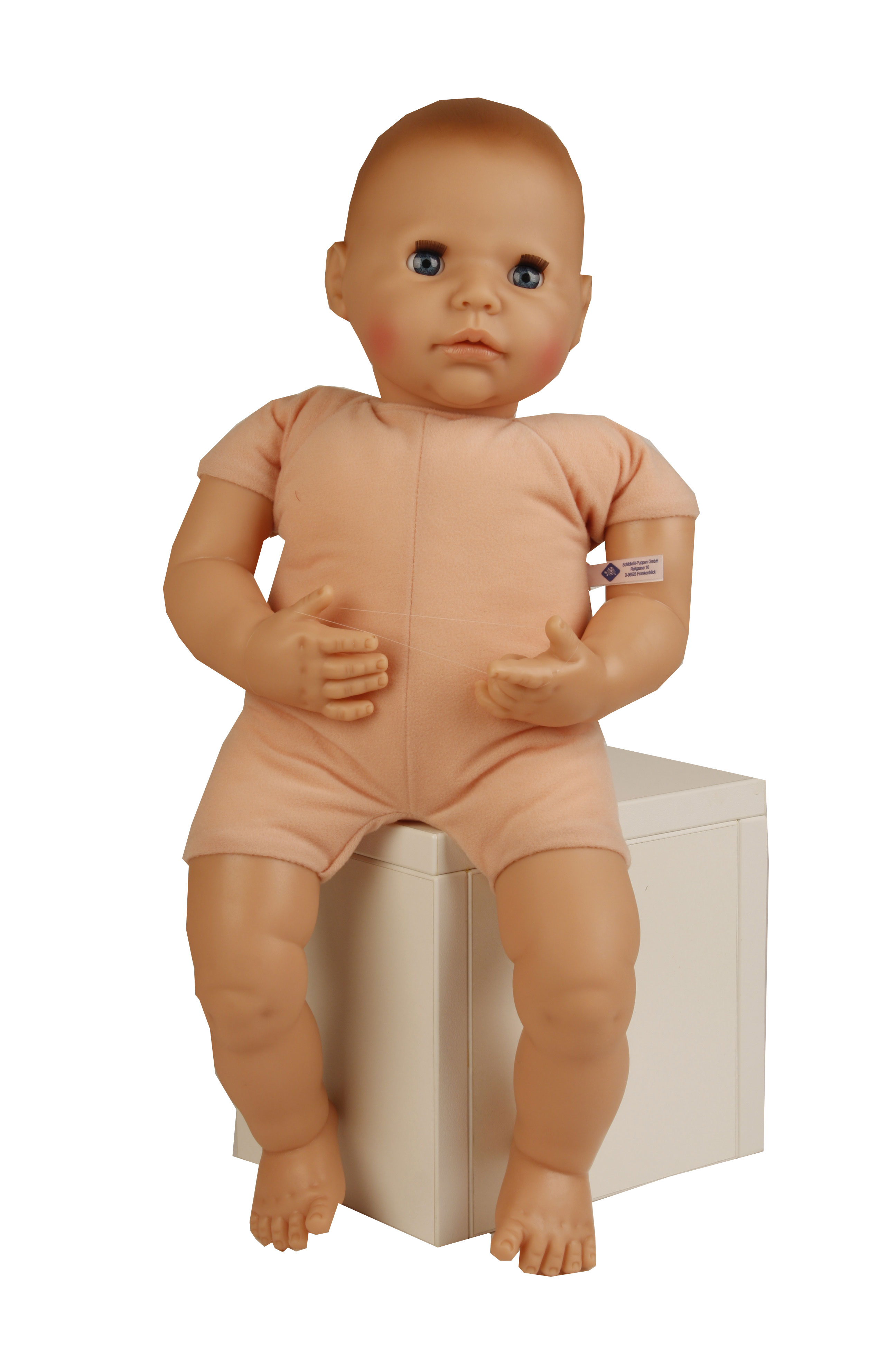 Unsere Schildkröt-Spielpuppe Peterle Gr. 52 ist ein Puppenjunge so richtig zum Liebhaben! Arme, Beine und Kopf sind aus Vinyl, sie hat einen weichen Stoffkörper. Sie ist in unserer Puppenmanufaktur in Rauenstein/Thüringen gefertigt. Durch den kuschelweichen, samtigen Körper mit Granulatsäckchen ist sie ein Schatz zum Knuddeln und Verwöhnen. Das gemalte, anmodellierte Haar ist besonders gut für Kinder geeignet, da abwaschbar. Die funkelnden Schlafaugen lassen das Peterle auch wie seine Puppenmutti am Abend schön einschlafen. Peterle trägt eine moderne Spielkleidung in weiss/mint/grau. Die Kleidung ist leicht an- und ausziehbar und bei 30 Grad waschbar. STICKEREI: Als besonderen Service bieten wir an, eine individuelle Widmung (z.B. Name und Geburtsdatum der Puppenmutti) mit einem kleinen Aufpreis auf den Puppenbauch zu sticken. Wenn Sie eine ganz persönliche Puppe für Ihr Kind möchten, dann geben Sie Ihre Wunschbestickung oben in die dafür vorgesehenen Felder ein.