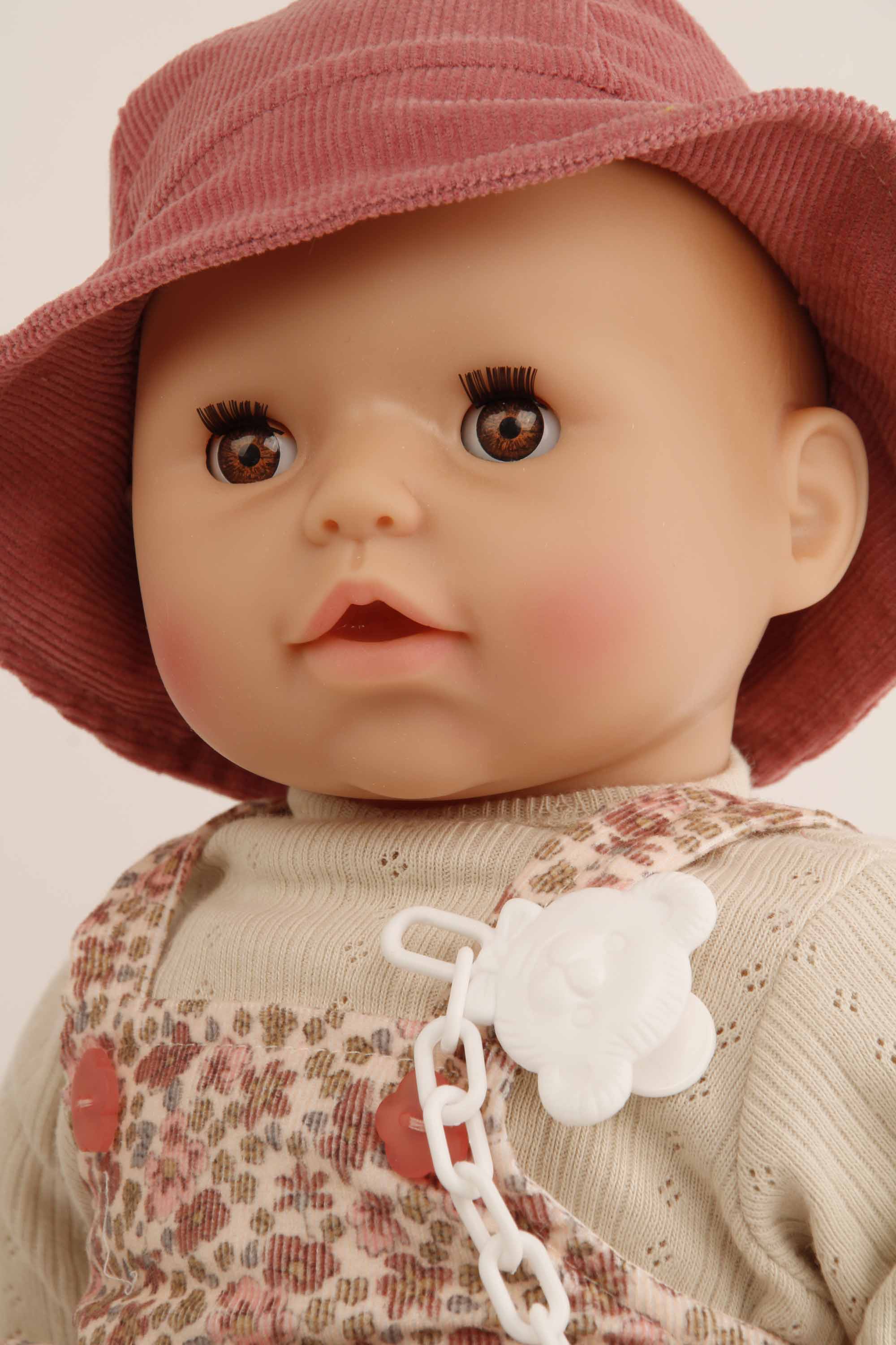 Baby Amy 45 cm mit Schnuller, Malhaar, braune Schlafaugen, Kleidung Blümchen
