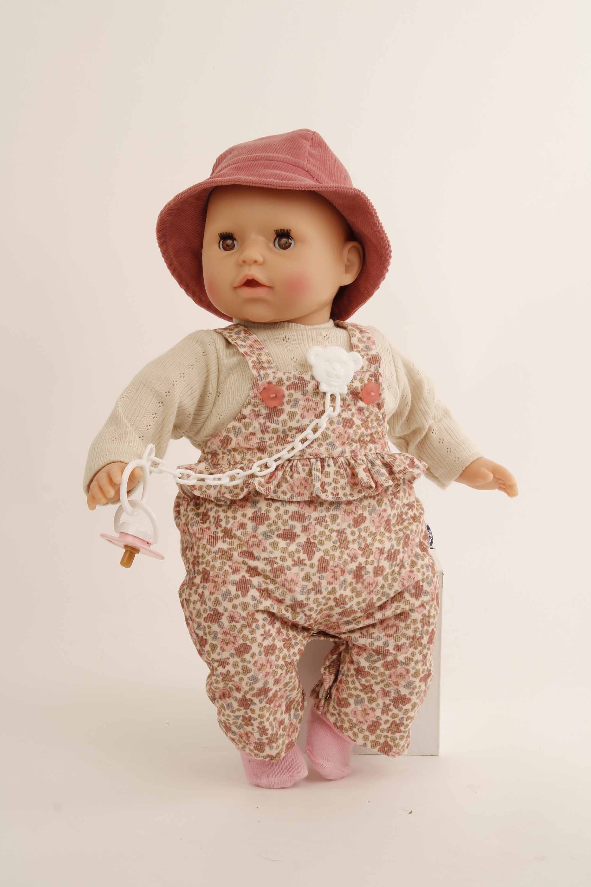 Die Kleidung besteht aus einem beigen Strukturshirt, einer Feincord-Latzhose mit Blümchen, einem passenden rosenholzfarbigen Hut. Die Söckchen 0045174, die Schnuller 0001017 und Windeln 0001034 können extra dazu bestellt werden. Die Kleidung wird komplett in Handarbeit in unserer Puppenmanufaktur in Rauenstein /Thüringen gefertigt. Diese Kleidung kann per Hand bei 30 Grad gewaschen werden. Die Puppe gehört nicht zum Lieferumfang. Achtung: nicht geeignet für Kinder unter 36 Monate, da Kleinteile sich lösen und verschluckt werden können.