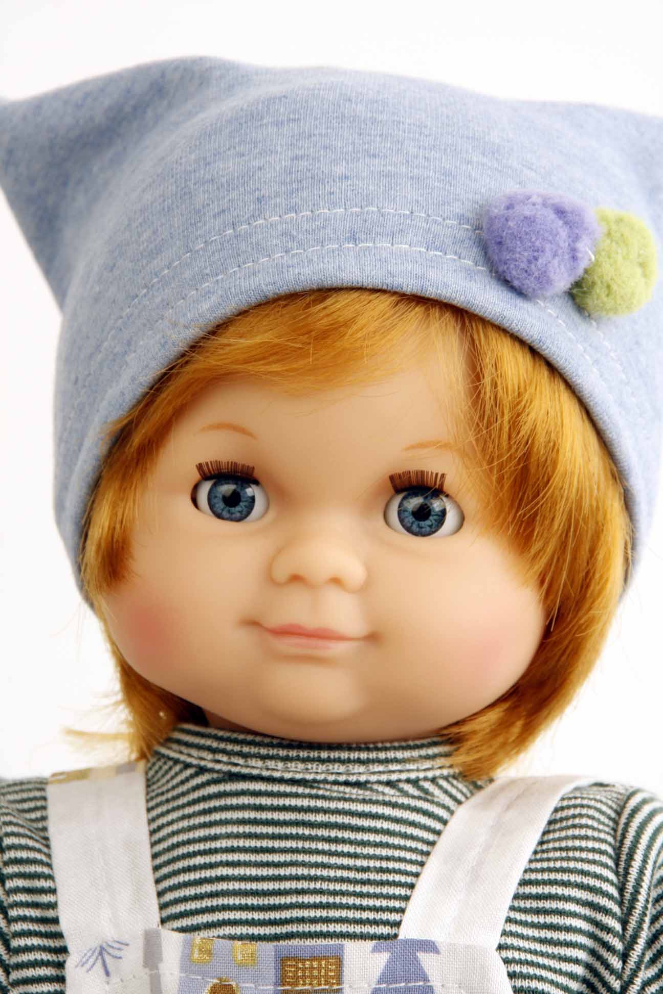 Die Puppe wird in unserer eigenen Puppenmanufaktur in Rauenstein/Thüringen hergestellt. Arme, Beine und Kopf sind aus Vinyl, sie hat lustige blaue Schlafaugen, sowie strapazierfähige, kämmbare, eingesteppte kurze, rote Haare. Es trägt eine winterliche Jungen-Spielkleidung, diese ist leicht an- und ausziehbar und bei 30 Grad per Hand waschbar.