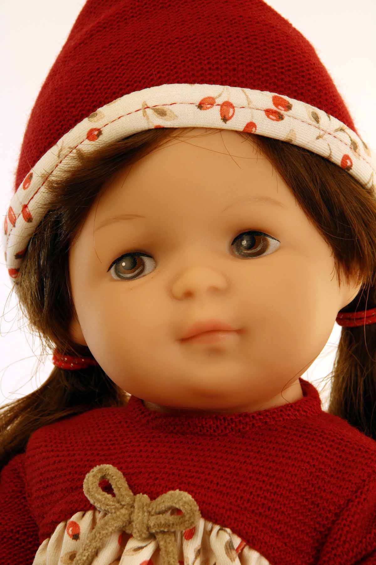 Produktinformationen "Puppe Strampelchen 37 braune Haare, braune Malaugen, Kleidung weiß/rot/beige"
