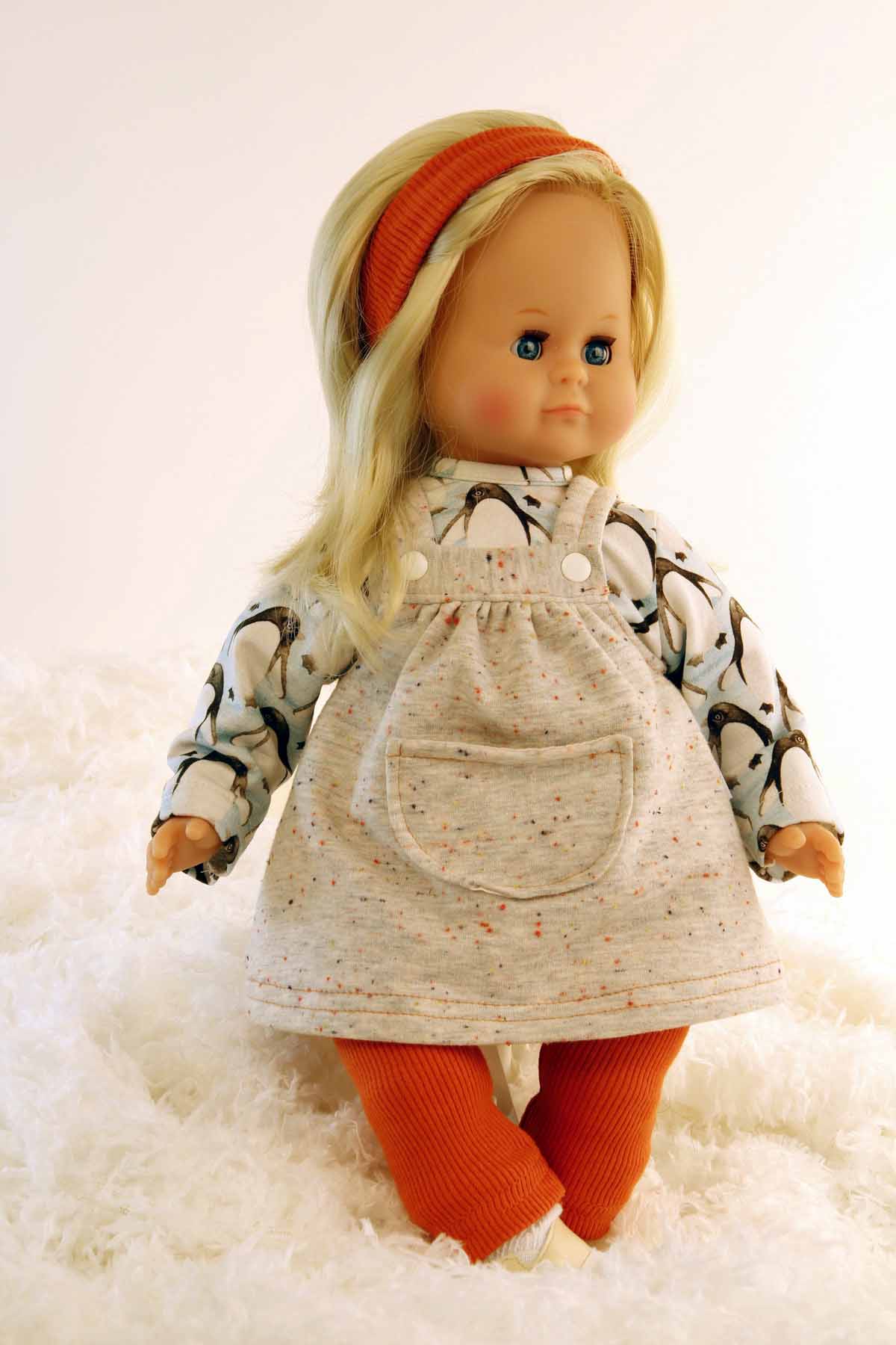 Arme, Beine und Kopf sind aus Vinyl, sie hat einen kuschelweichen Stoffkörper, funkelnde Schlafaugen und kämmbare, eingesteppte, blonde Haare. Sie trägt eine moderne Spielkleidung mit Pinguindruck, diese ist leicht an- und ausziehbar und bei 30 Grad waschbar. Die Puppe ist in Rauenstein/Thüringen gefertigt.