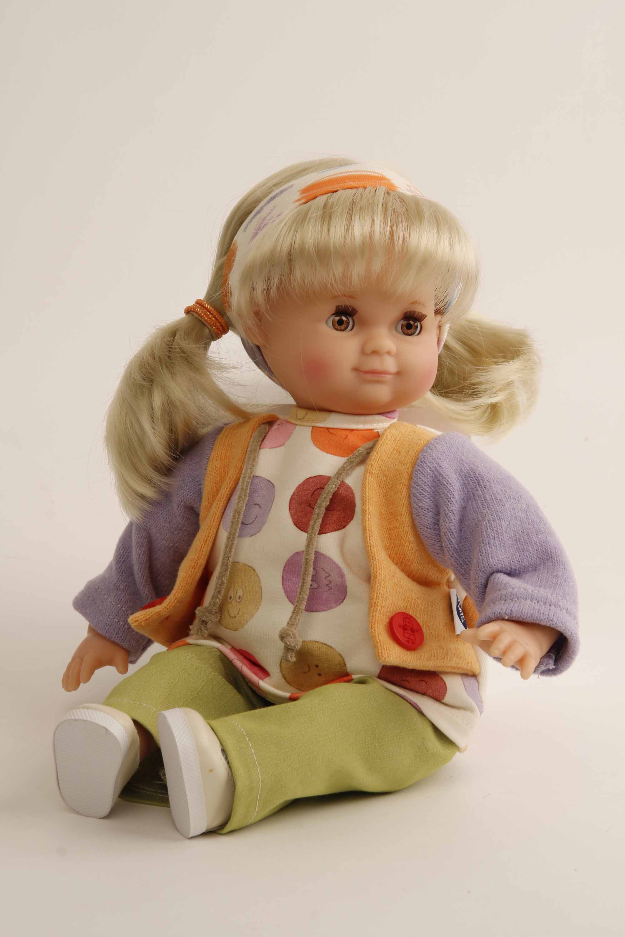 Die Puppe wird in unserer eigenen Puppenmanufaktur in Rauenstein/Thüringen hergestellt. Arme, Beine und Kopf sind aus Vinyl, sie hat lustige blaue Schlafaugen, sowie strapazierfähige, kämmbare, eingesteppte braune Haare. Es trägt eine bunte Spielkleidung mit Smileys, diese ist leicht an- und ausziehbar und bei 30 Grad per Hand waschbar.