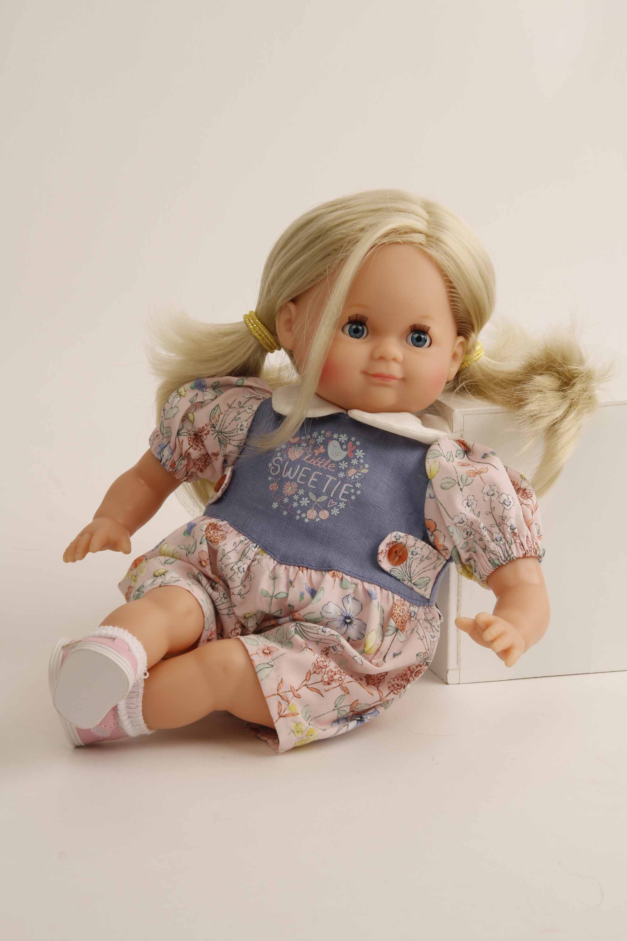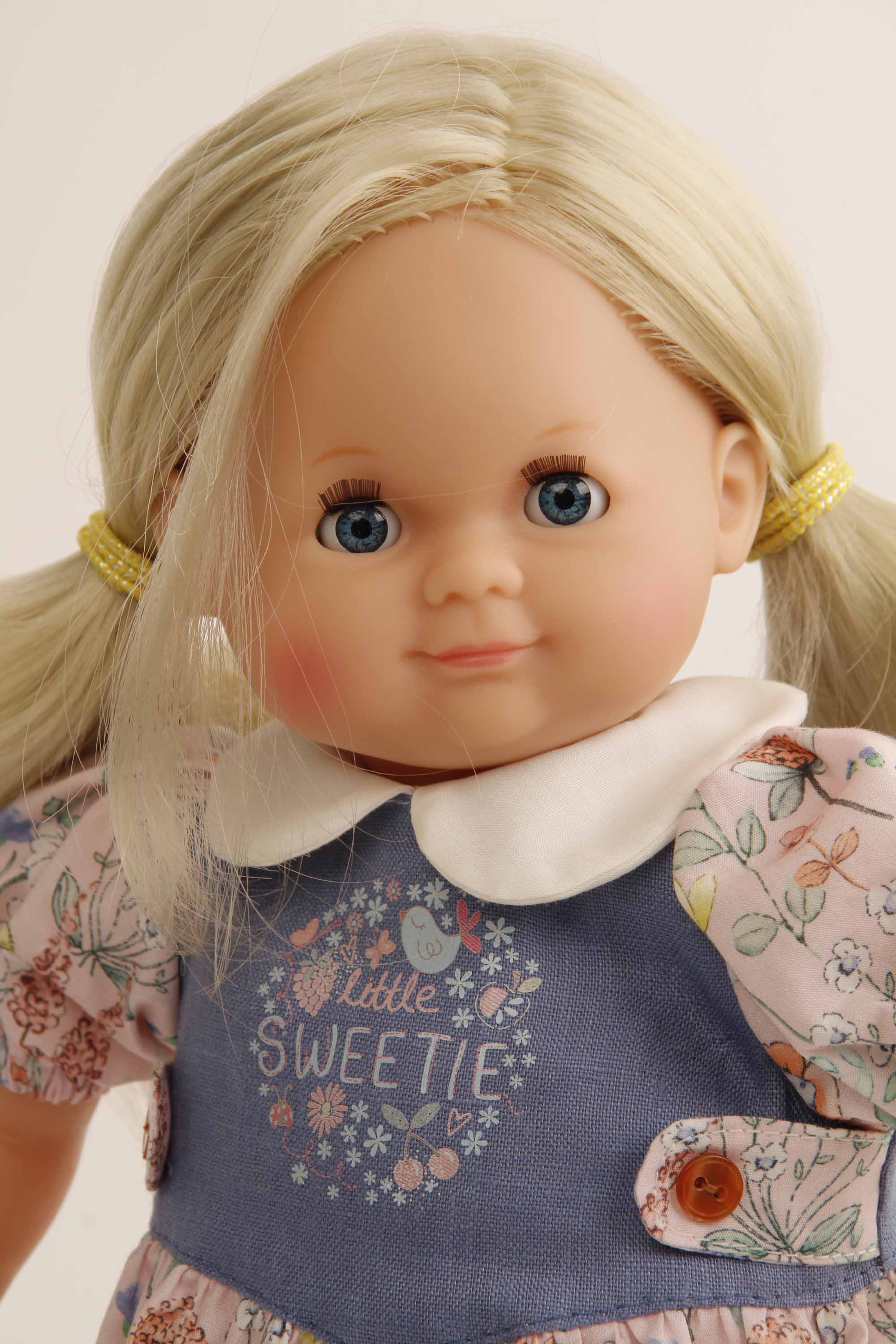 Die Puppe wird in unserer eigenen Puppenmanufaktur in Rauenstein/Thüringen hergestellt. Arme, Beine und Kopf sind aus Vinyl, sie hat lustige blaue Schlafaugen, sowie strapazierfähige, kämmbare, eingesteppte blonde Haare. Es trägt einen Blumenoverall in rose/blau, dieser ist leicht an- und ausziehbar und bei 30 Grad per Hand waschbar.