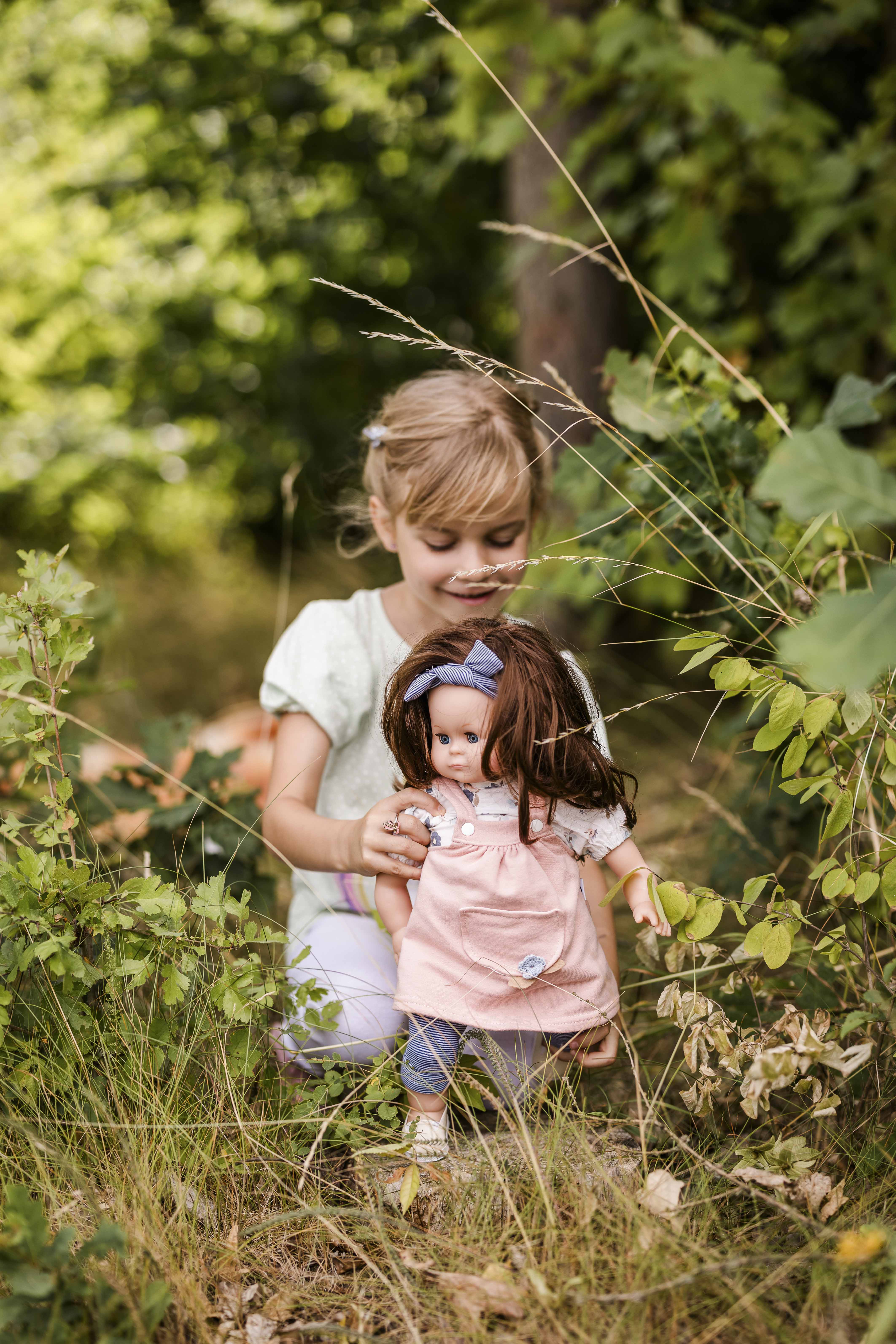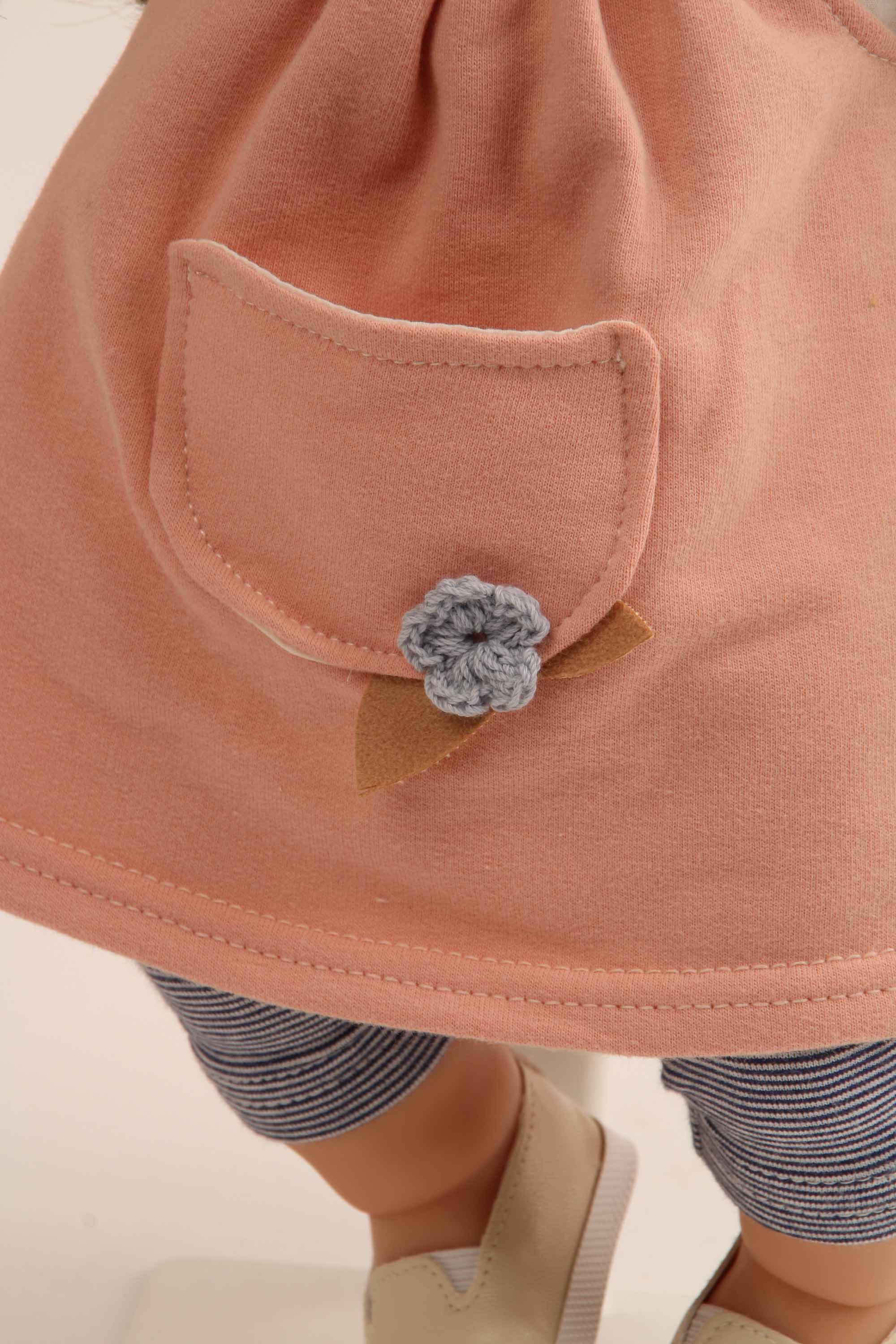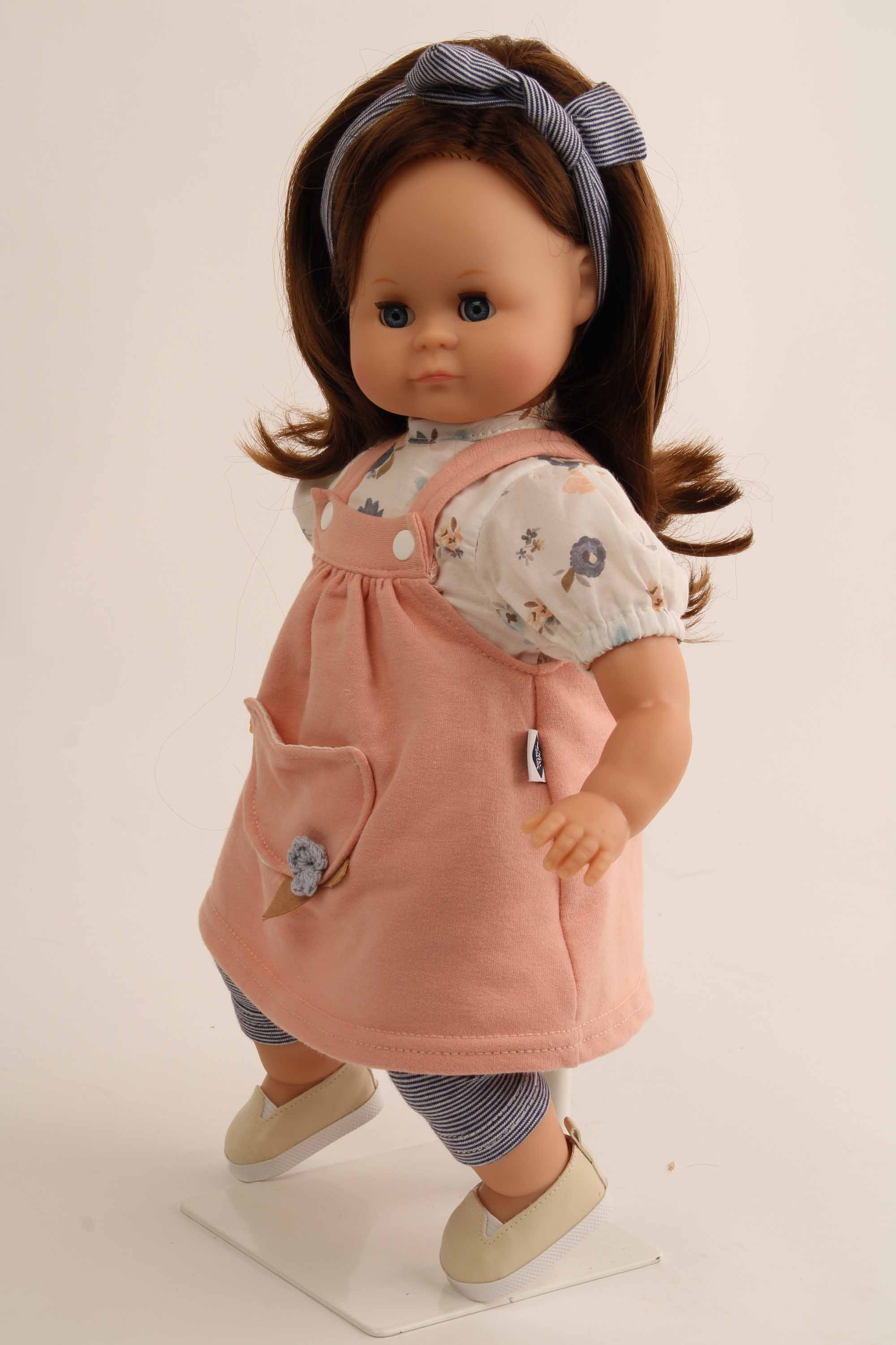 Arme, Beine und Kopf sind aus Vinyl, sie hat einen kuschelweichen Stoffkörper, funkelnde Schlafaugen und kämmbare, eingesteppte, braune Haare. Sie trägt eine moderne Spielkleidung in rose/weiss/blau, diese ist leicht an- und ausziehbar und bei 30 Grad waschbar. Die Puppe ist in Rauenstein/Thüringen gefertigt.