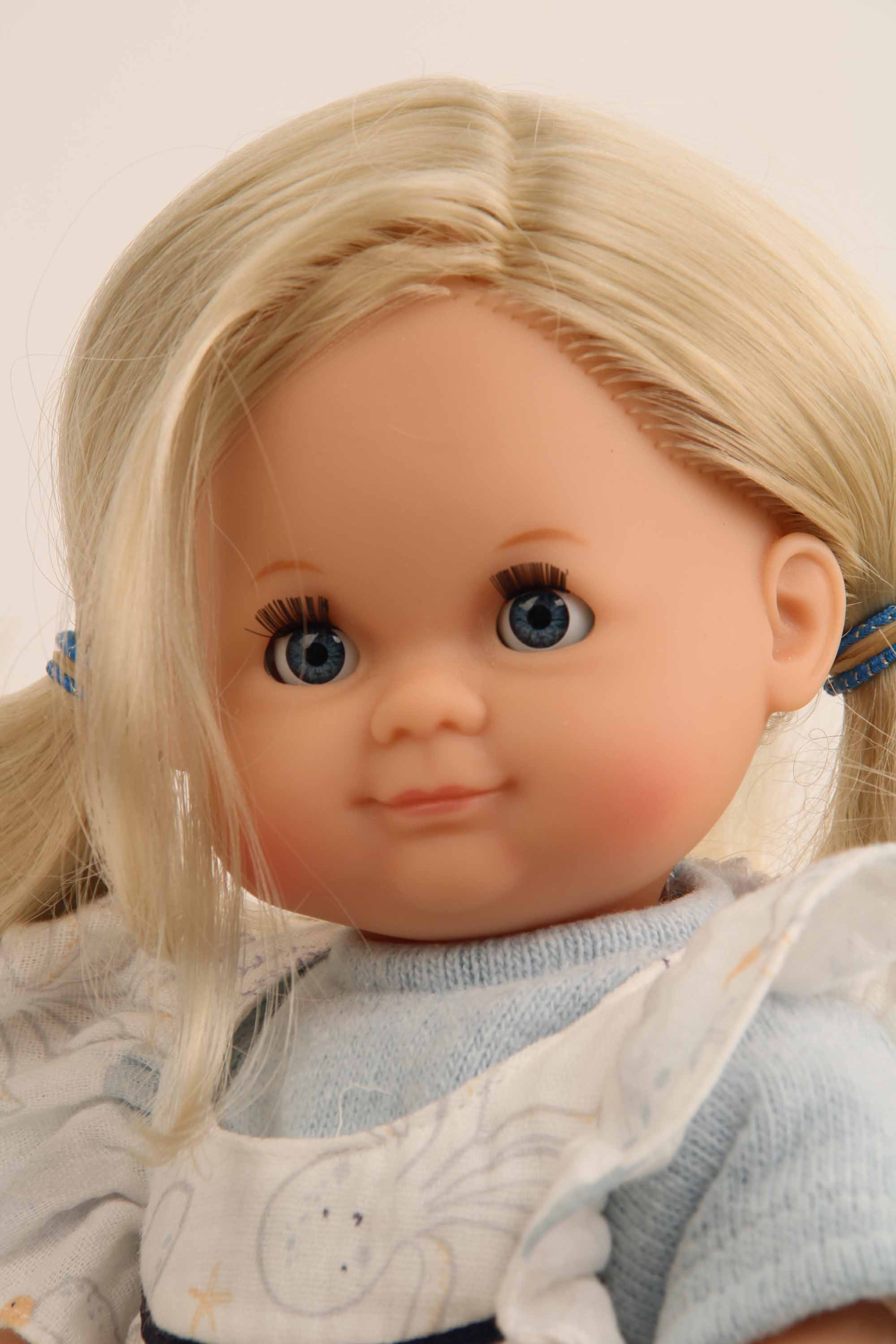 Die Puppe wird in unserer eigenen Puppenmanufaktur in Rauenstein/Thüringen hergestellt. Arme, Beine und Kopf sind aus Vinyl, sie hat lustige blaue Schlafaugen, sowie strapazierfähige, kämmbare, eingesteppte blonde Haare. Es trägt eine Kleidung in blau/weiss mit Delphindruck. Diese ist leicht an- und ausziehbar und bei 30 Grad per Hand waschbar.