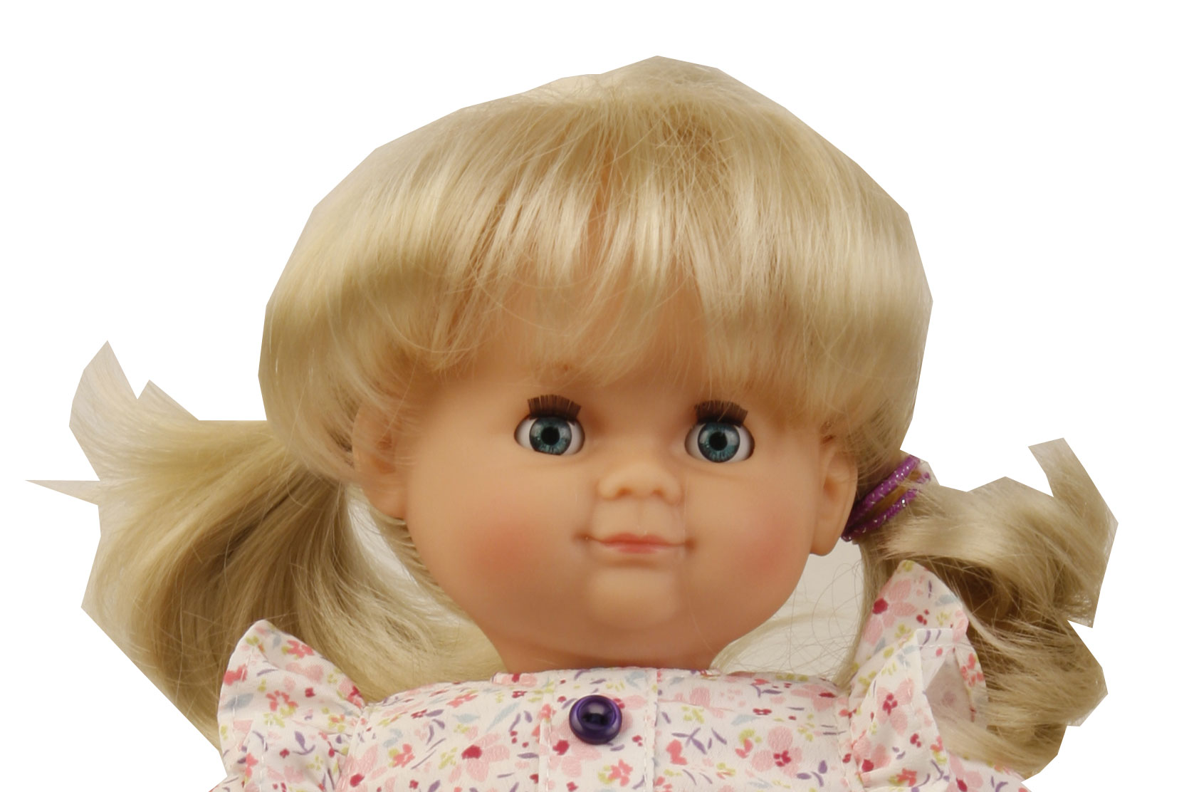 Die Puppe wird in unserer eigenen Puppenmanufaktur in Rauenstein/Thüringen hergestellt. Arme, Beine und Kopf sind aus Vinyl, sie hat lustige blaue Schlafaugen, sowie strapazierfähige, kämmbare, eingesteppte blonde Haare. Es trägt eine sommerliche Kleidung mit Blumendruck. Diese ist leicht an- und ausziehbar und bei 30 Grad per Hand waschbar.