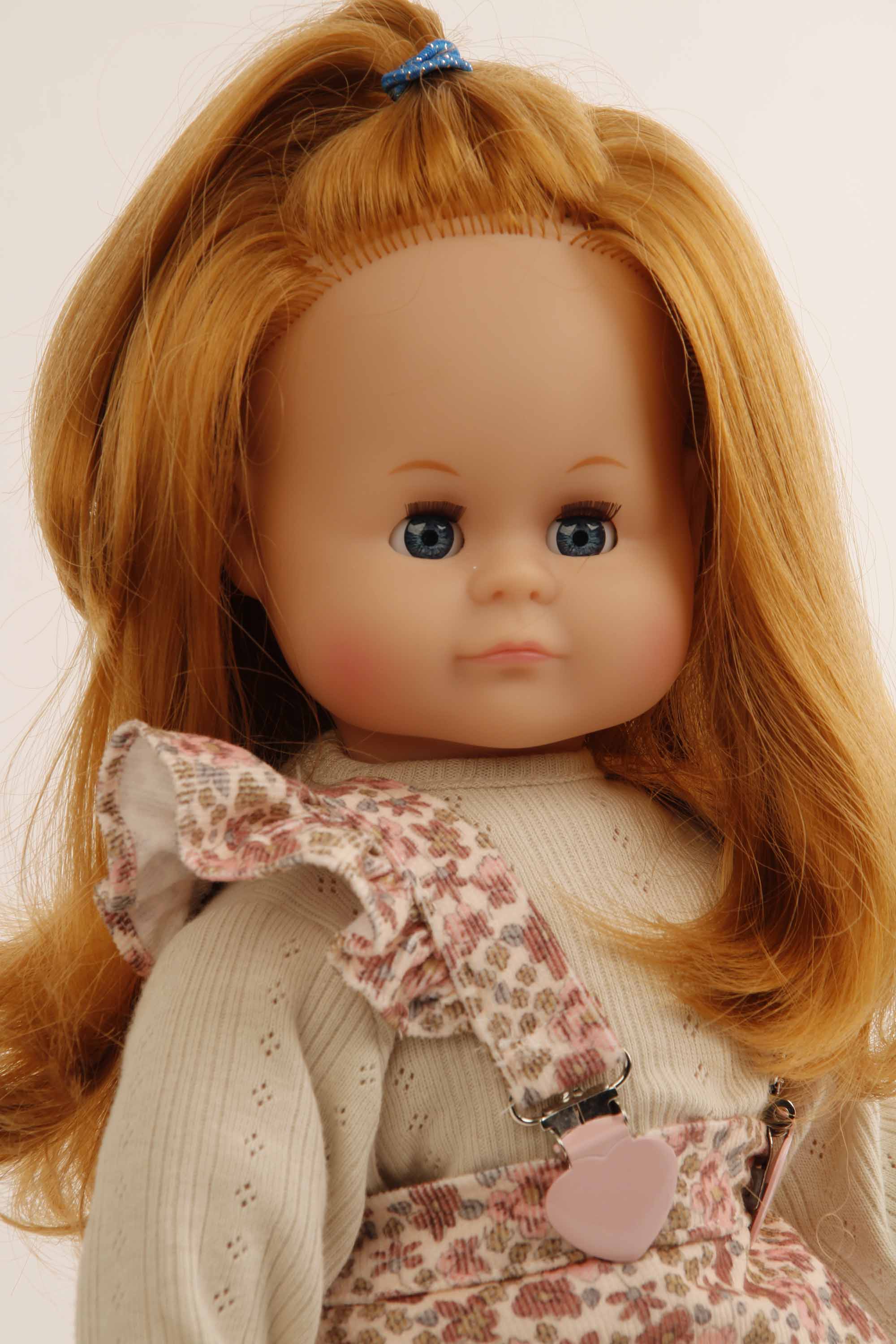 Arme, Beine und Kopf sind aus Vinyl, sie hat einen kuschelweichen Stoffkörper, funkelnde blaue Schlafaugen und kämmbare, eingesteppte, rote Haare. Sie trägt eine moderne Spielkleidung mit Blumenmuster , diese ist leicht an- und ausziehbar und bei 30 Grad waschbar. Die Puppe wird komplett in Handarbeit in unserer Puppenmanufaktur in Rauenstein /Thüringen gefertigt.