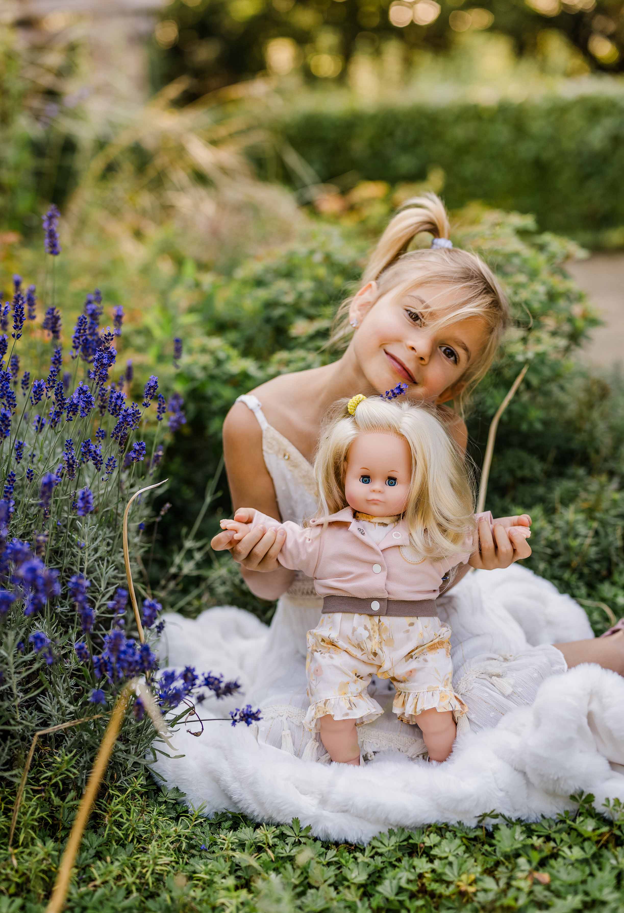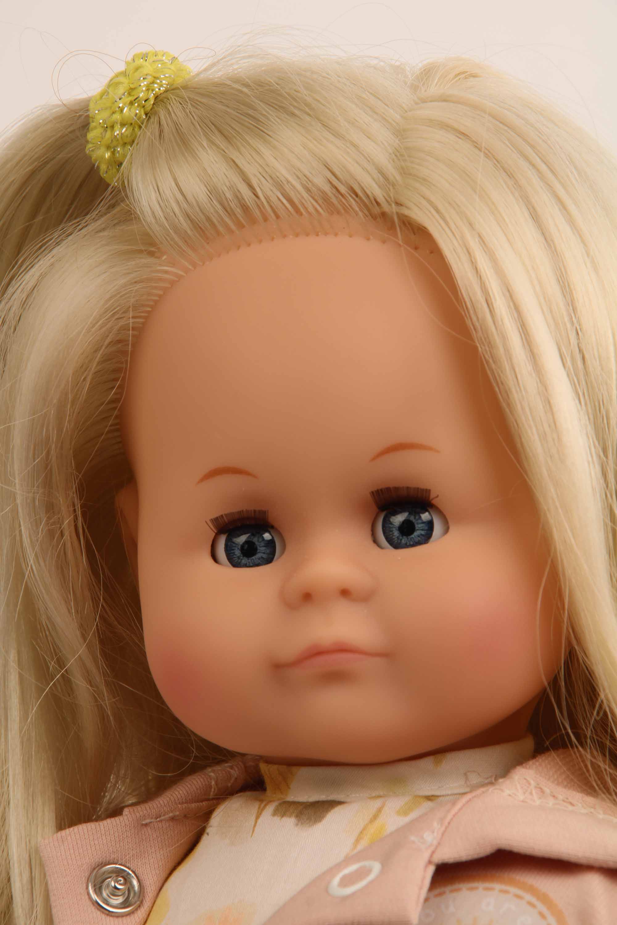 Arme, Beine und Kopf sind aus Vinyl, sie hat einen kuschelweichen Stoffkörper, funkelnde blaue Schlafaugen und kämmbare, eingesteppte, blonde Haare. Sie trägt einen Overall mit Tierdruck Afrika und eine rose Kapuzenjacke darüber. Diese ist leicht an- und ausziehbar und bei 30 Grad waschbar. Die Puppe ist in Rauenstein/Thüringen gefertigt.
