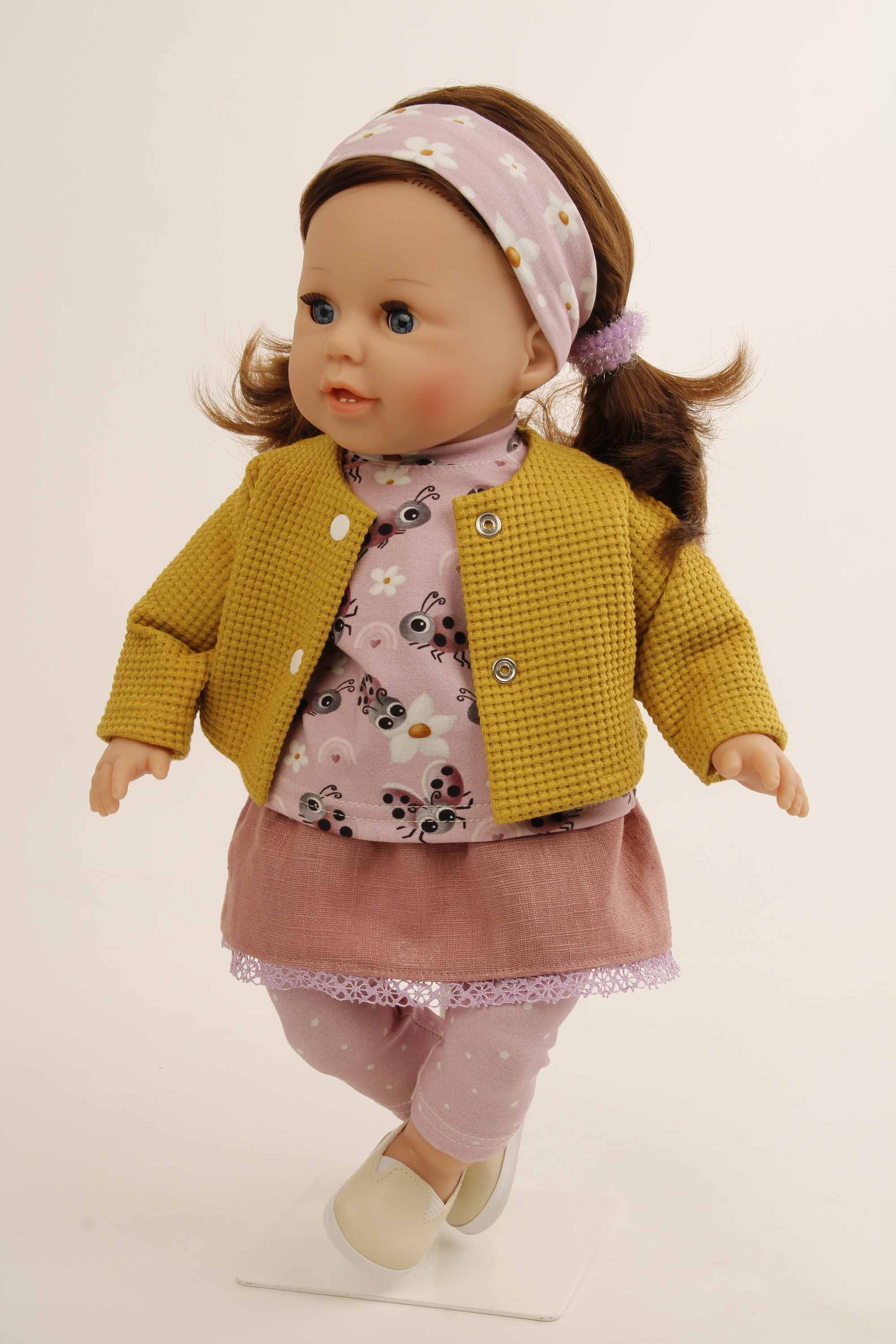 Die Kleidung besteht aus einer bedruckter Leggings, einem braunen Kleid mit Tupfen, einer rose Jacke und passendem Stirnband mit Blätterdruck. Die Kleidung wird komplett in Handarbeit in unserer Puppenmanufaktur in Rauenstein /Thüringen gefertigt. Diese Kleidung kann per Hand bei 30 Grad gewaschen werden. Die Puppe gehört nicht zum Lieferumfang. Achtung: nicht geeignet für Kinder unter 36 Monate, da Kleinteile sich lösen und verschluckt werden können.