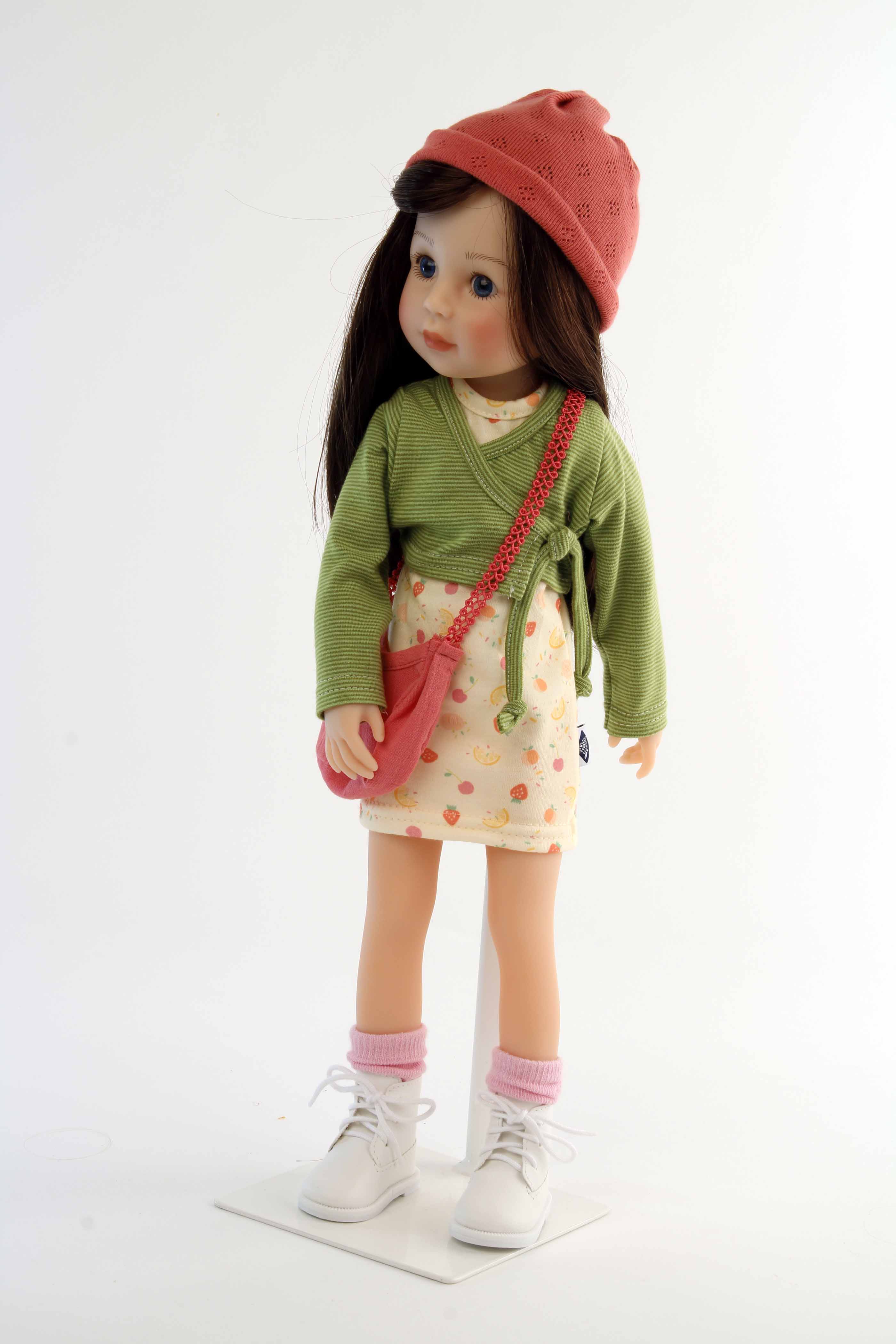 Stehpuppe Yella 46 cm braune Haare, Kleidung gelb/grün/rot
