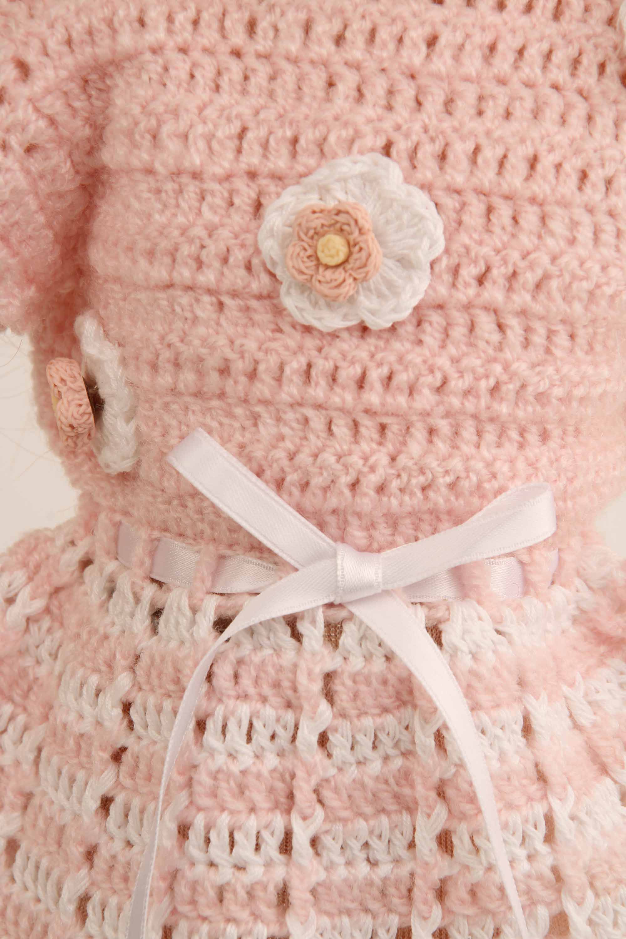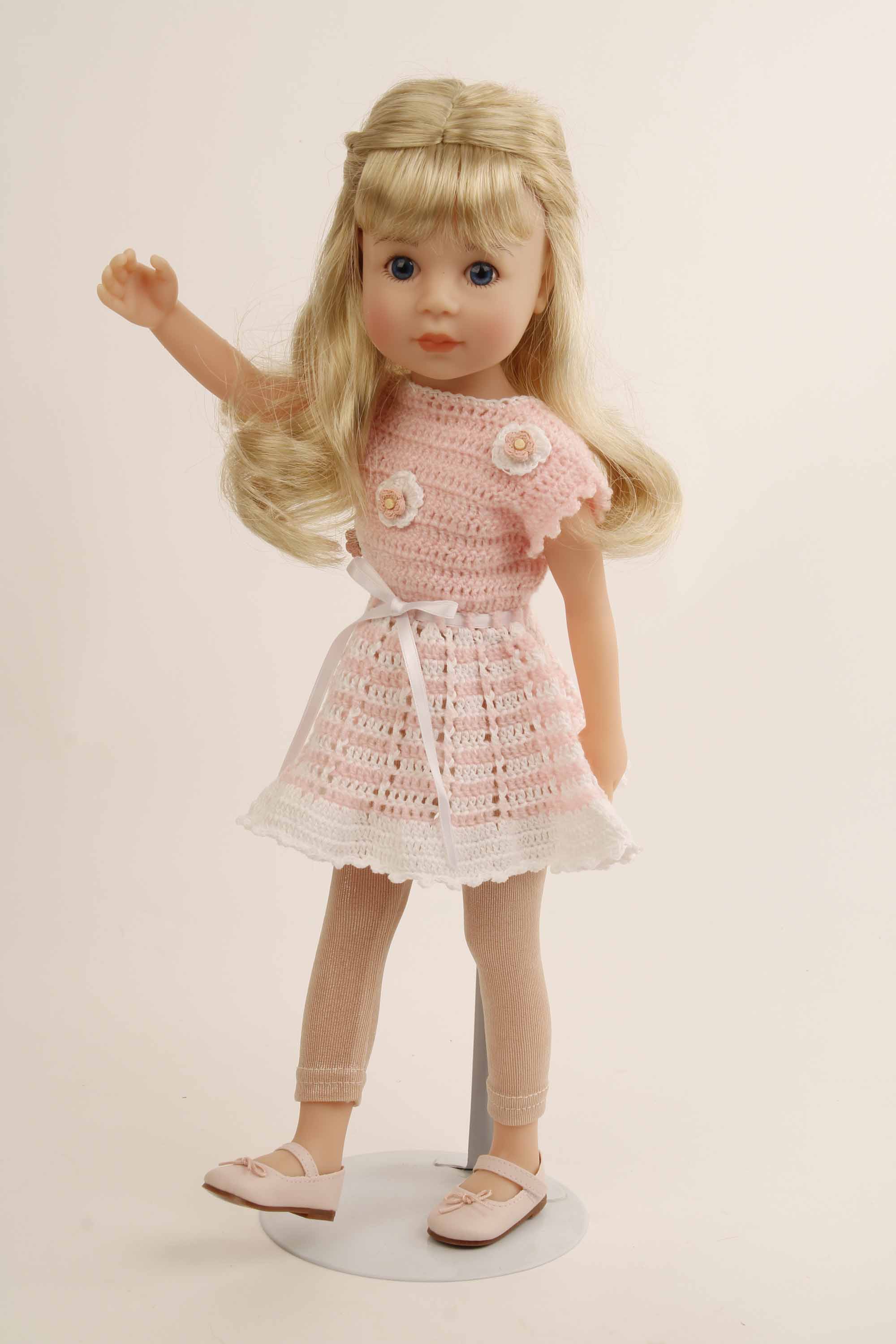 Stehpuppe Yella 46 cm blonde Haare, Häkelkleidung rose/weiss
