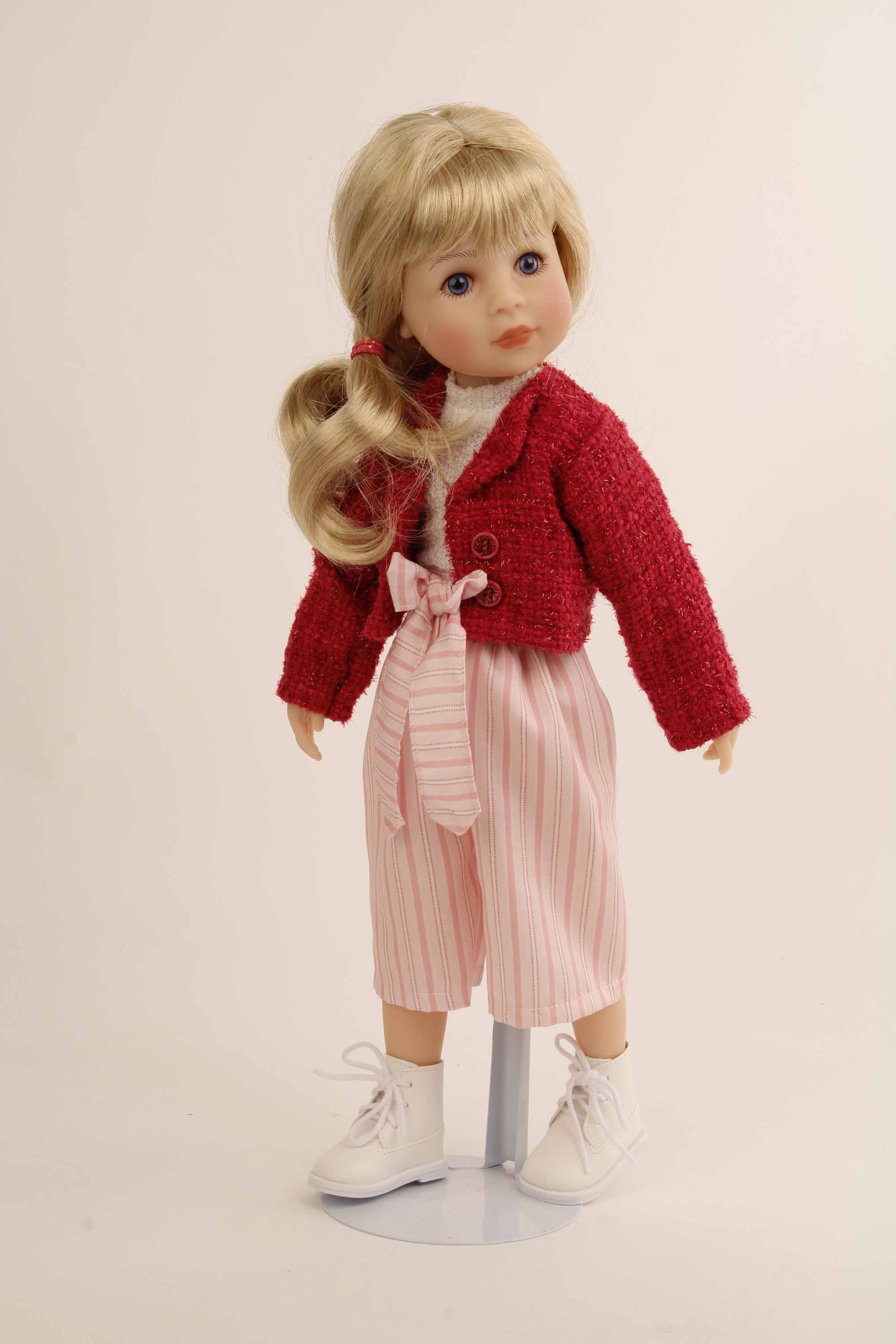 Kleidung für Stehpuppe Yella bestehend aus 3/4 langer Streifenhose in weiss/rose, einer weisser Pulli und roter Bucclèjacke. Die Kleidung wird komplett in Handarbeit in unserer Puppenmanufaktur in Rauenstein /Thüringen gefertigt. . Die Stiefel können extra unter 0046179 bestellt werden. Diese Kleidung kann per Hand bei 30 Grad gewaschen werden. Die Puppe gehört nicht zum Lieferumfang. Achtung: nicht für Kinder unter 36 Monate geeignet, da Kleinteile verschluckt werden können.