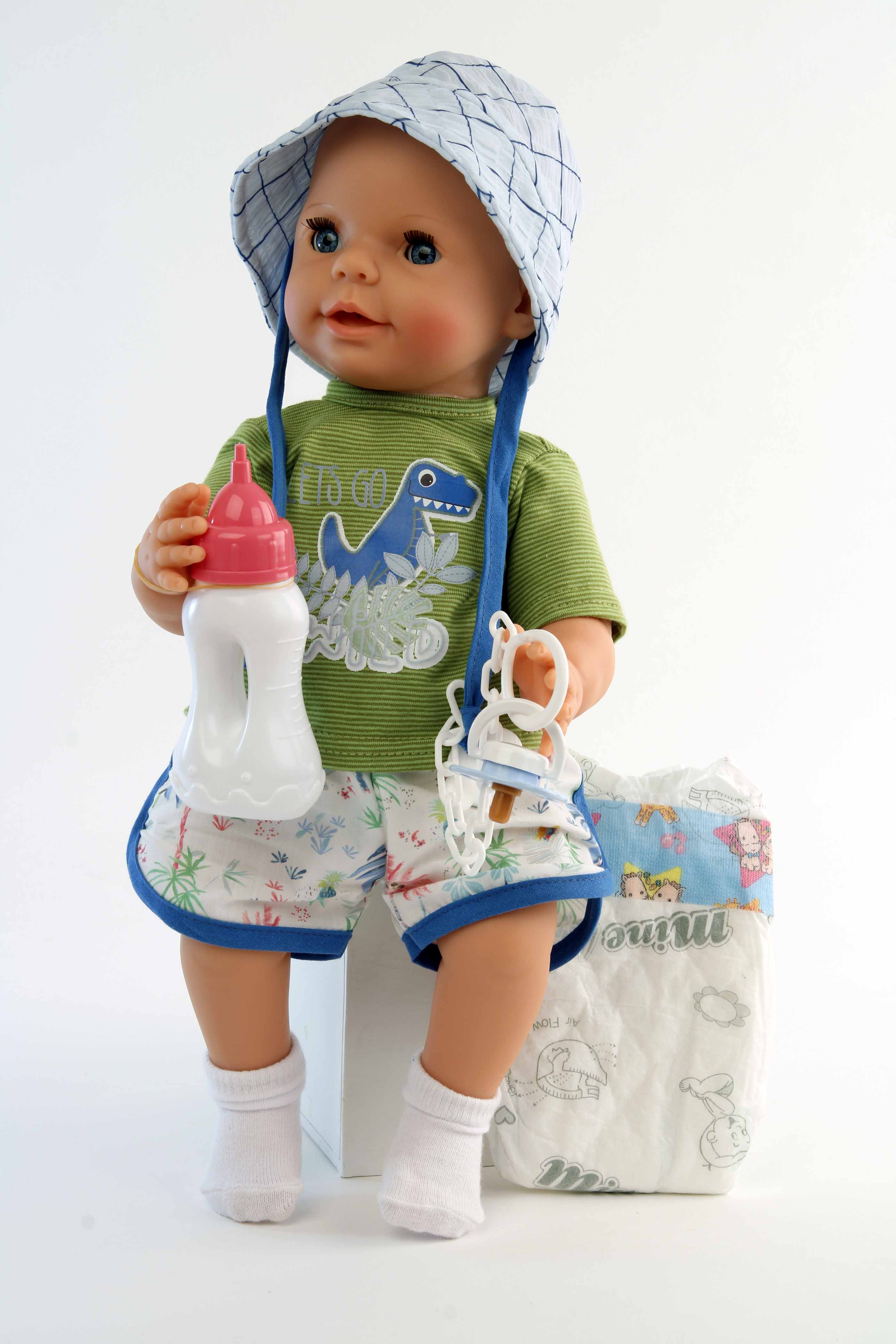 Trink + Näßbaby "Finn" 40 cm mit Malhaar und blauen Schlafaugen, Kleidung Dino