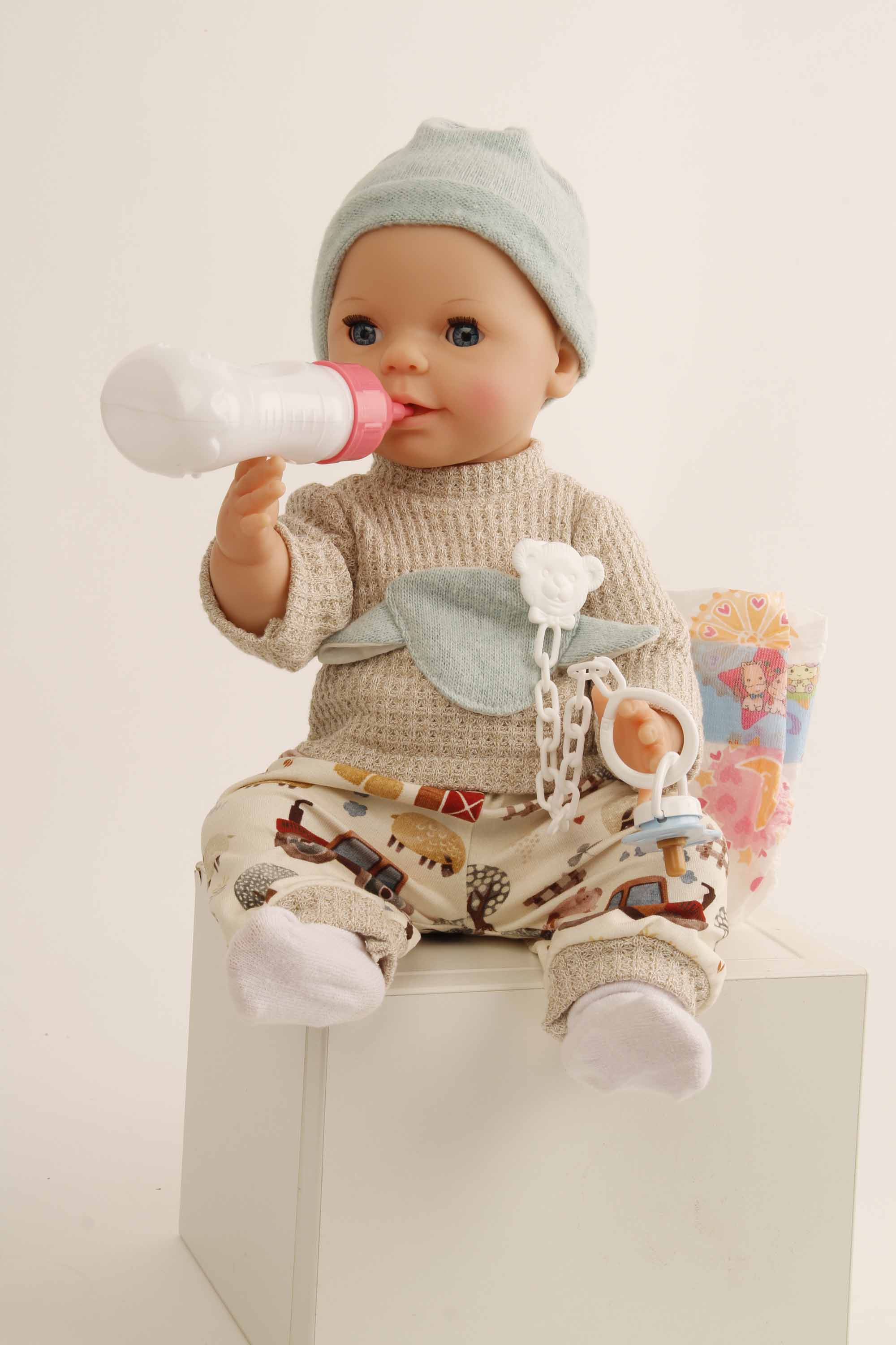 Entdecken Sie unser Trink- und Näßbaby Finn – 40 cm pure Freude! Finn ist das perfekte Spielzeug für kleine Puppeneltern! Mit seinen 40 cm kann er wie seine großen Geschwister gefüttert werden und sogar aufs Töpfchen gehen. Für unterwegs hat Finn eine praktische Windel und einen beruhigenden Schnuller dabei, damit Ihr Kind immer bestens ausgestattet ist. Hergestellt aus hochwertigem Vollviny, begeistert Finn mit funkelnden blauen Schlafaugen und einem charmanten, gemalten Haar. Im Set enthalten sind die Puppe, eine Flasche und ein Schnuller – alles, was Ihr Kind für fantasievolles Spielen benötigt. Finn trägt eine moderne Spielkleidung im maritimen Stil, die ihn zu einem stilvollen Begleiter macht. Bitte beachten Sie, dass die Puppe nicht wasserdicht ist und daher nicht gebadet werden kann. Für das Töpfchen-Spiel empfehlen wir unseren passenden Nachttopf (Artikelnummer 0001014). Wichtiger Hinweis: Nicht geeignet für Kinder unter 36 Monaten, da Kleinteile verschluckt werden können. Bringen Sie mit Finn ein Stück Puppenliebe in Ihr Zuhause!