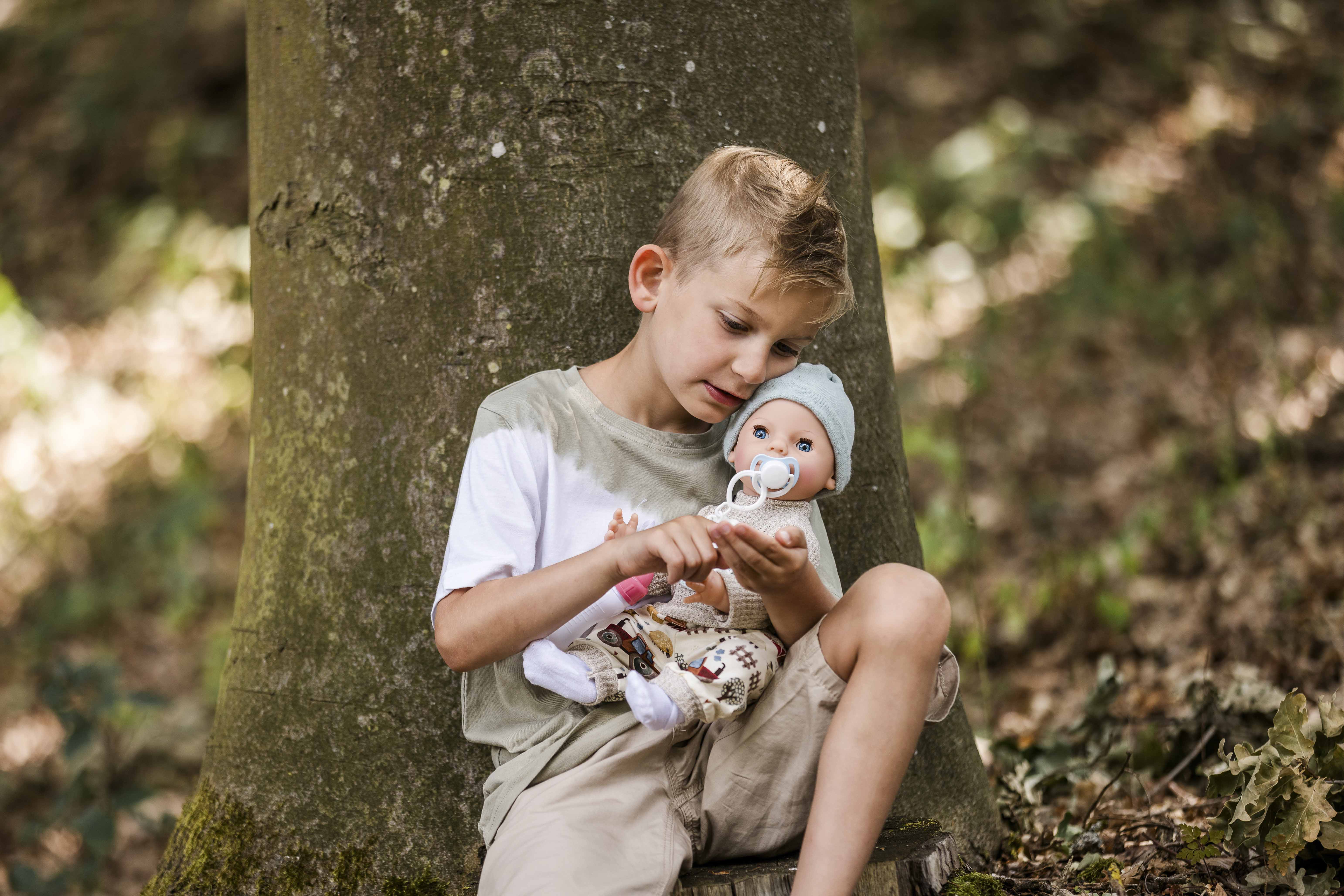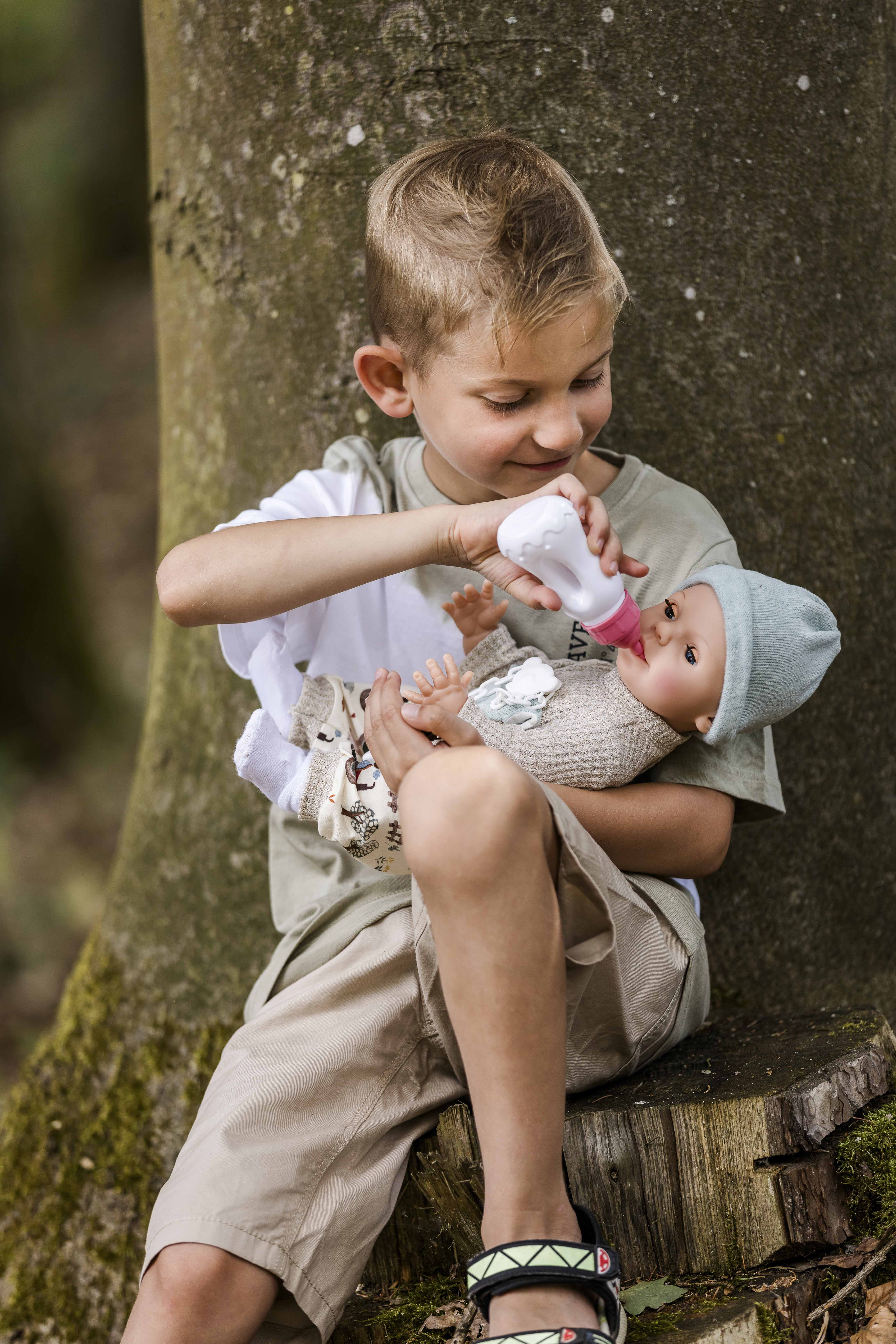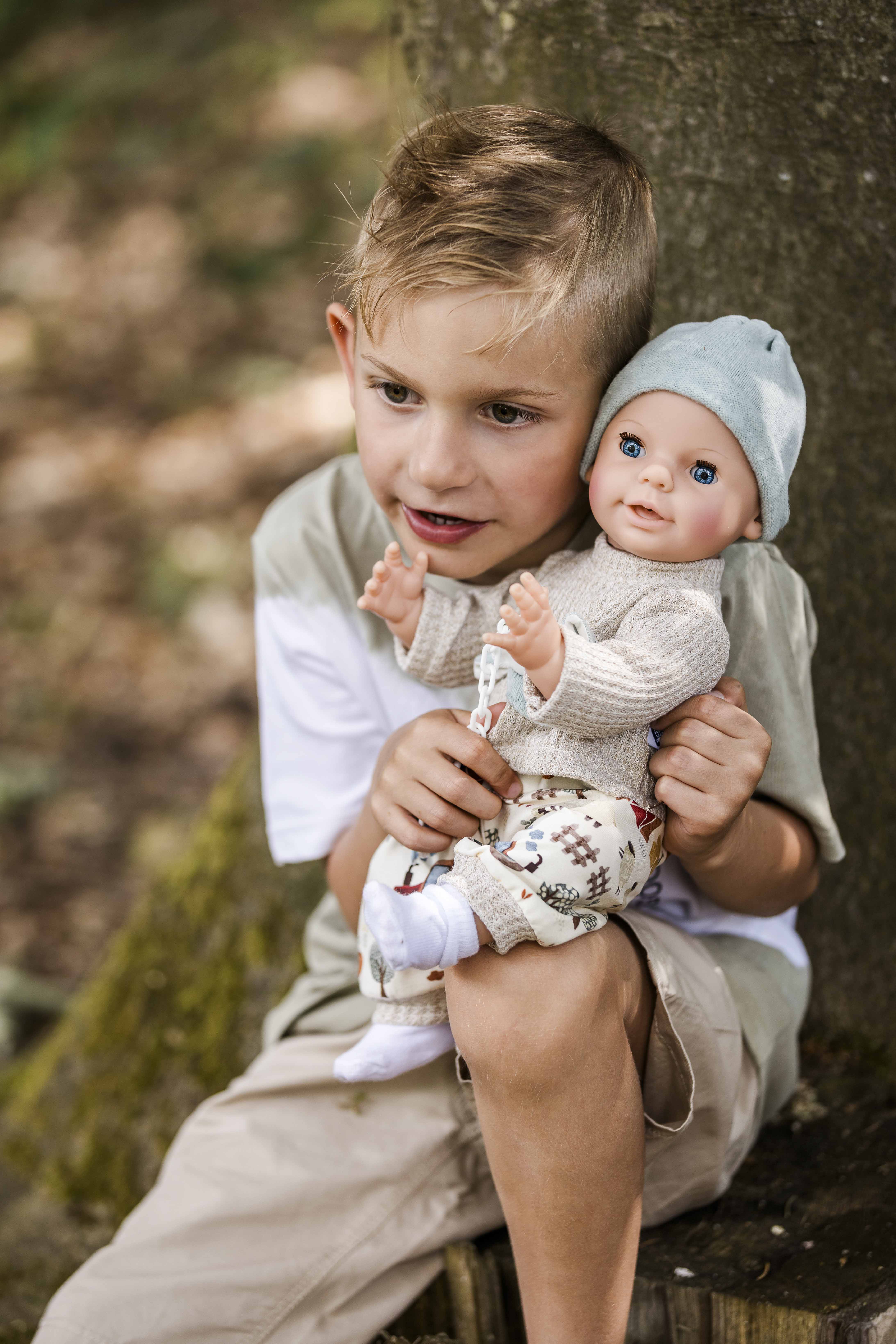 Finn trägt eine moderne Spielkleidung mit Bauernhof-Druck, die ihn zu einem stilvollen Begleiter macht. Bitte beachten Sie, dass die Puppe nicht wasserdicht ist und daher nicht gebadet werden kann. Für das Töpfchen-Spiel empfehlen wir unseren passenden Nachttopf (Artikelnummer 0001014).