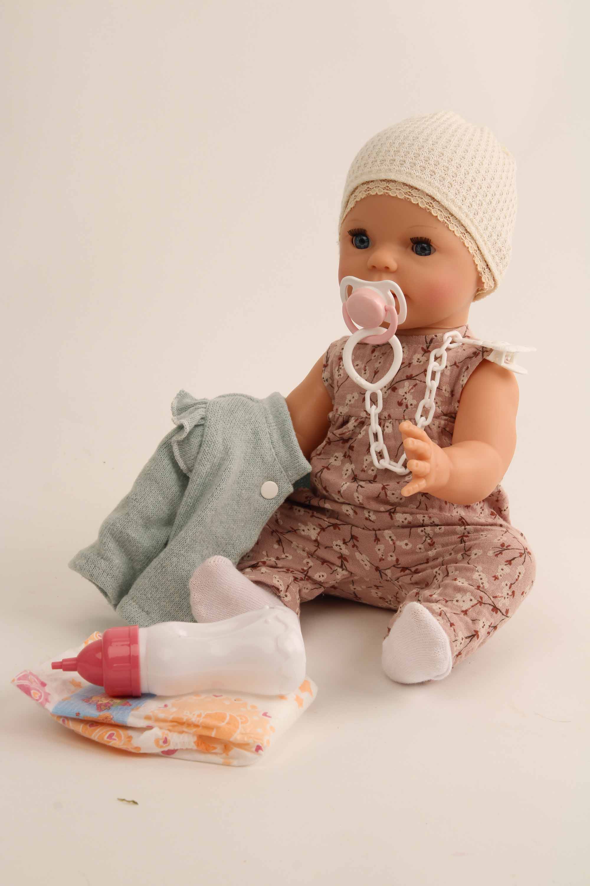 Entdecken Sie unser Trink- und Näßbaby Finn – 40 cm pure Freude! Finn ist das perfekte Spielzeug für kleine Puppeneltern! Mit seinen 40 cm kann er wie seine großen Geschwister gefüttert werden und sogar aufs Töpfchen gehen. Für unterwegs hat Finn eine praktische Windel und einen beruhigenden Schnuller dabei, damit Ihr Kind immer bestens ausgestattet ist.Hergestellt aus hochwertigem Vollviny, begeistert Finn mit funkelnden blauen Schlafaugen und einem charmanten, gemalten Haar. Im Set enthalten sind die Puppe, eine Flasche und ein Schnuller – alles, was Ihr Kind für fantasievolles Spielen benötigt. Finn trägt eine moderne Spielkleidung mit Bauernhof-Druck, die ihn zu einem stilvollen Begleiter macht. Bitte beachten Sie, dass die Puppe nicht wasserdicht ist und daher nicht gebadet werden kann. Für das Töpfchen-Spiel empfehlen wir unseren passenden Nachttopf (Artikelnummer 0001014). Wichtiger Hinweis: Nicht geeignet für Kinder unter 36 Monaten, da Kleinteile verschluckt werden können. Bringen Sie mit Finn ein Stück Puppenliebe in Ihr Zuhause!