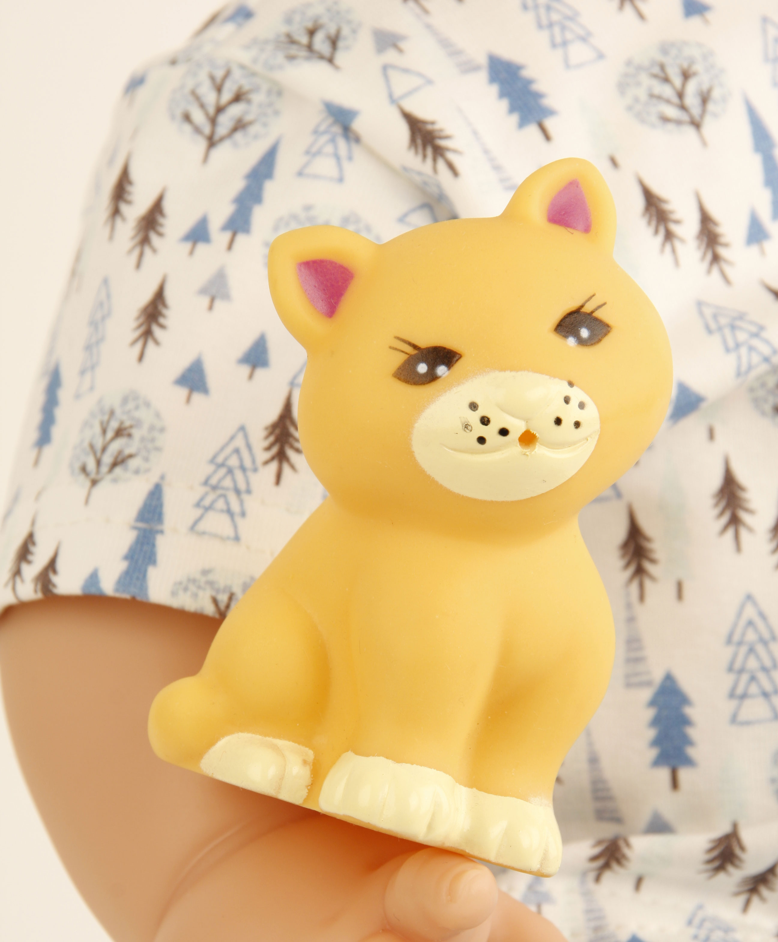 Die Puppe hat gemaltes Haar und blaue Schlafauchen. Sie hat einen kleinen Gummi-Kraken (keinen Tiger wie auf dem Bild) dabei.