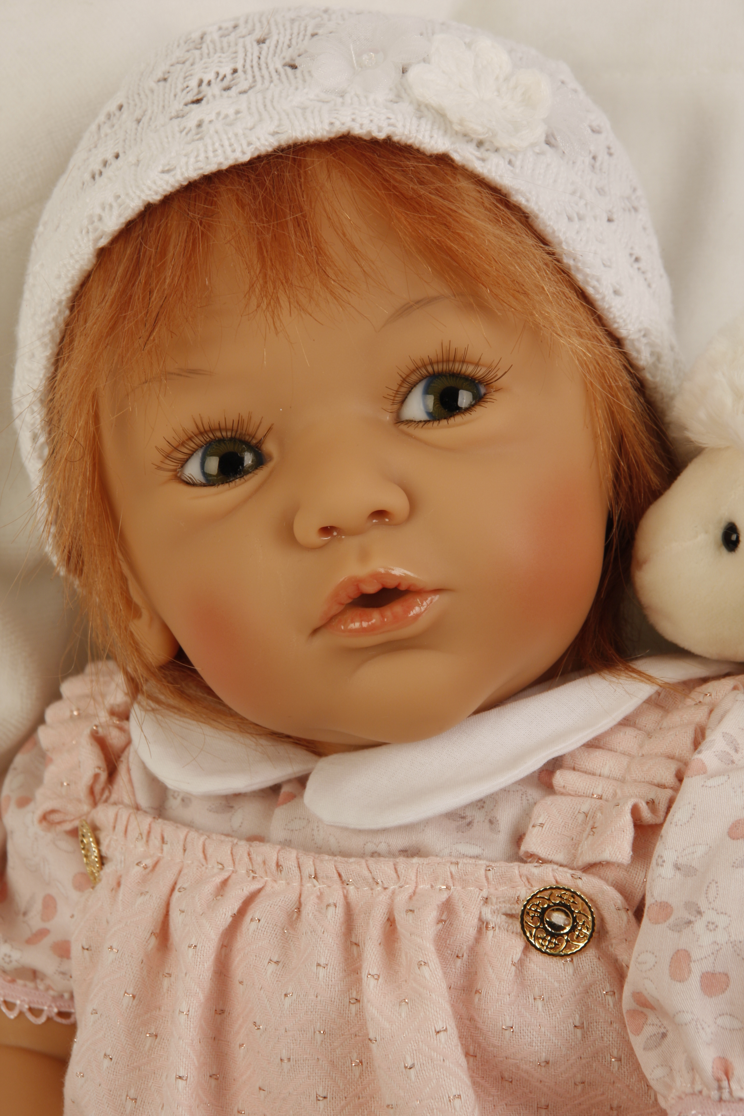 Rosalie ist ein süßes Puppenkind so richtig zum Liebhaben. Sie hat ein ausgefallenes, wunderschönes modelliertes Gesichtchen. Die Puppe hat ein Sitzgestell und man kann Kopf, Beine und Arme sehr gut bewegen. Sie hat eine rote handgeknüpfte Echthaarperücke, das Haar wirkt wie aus dem Kopf gewachsen. Die funkelnden Glasaugen, in Lauscha mundgeblasen, sind blau/topas. Rosalie ist modern bekleidet und hat ihr Schäfchen als Spielgefährten dabei. Die Puppe ist nicht limitiert.