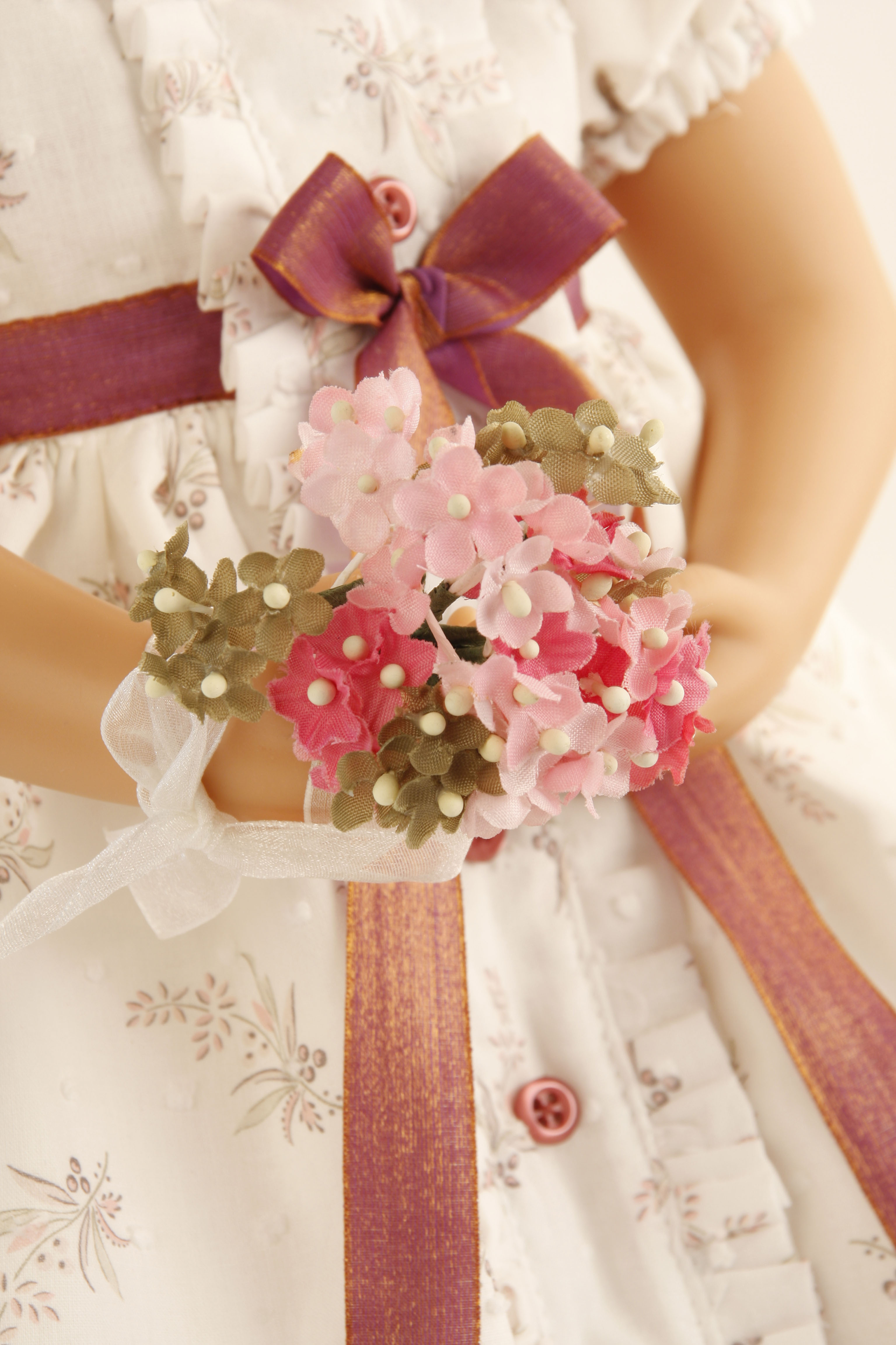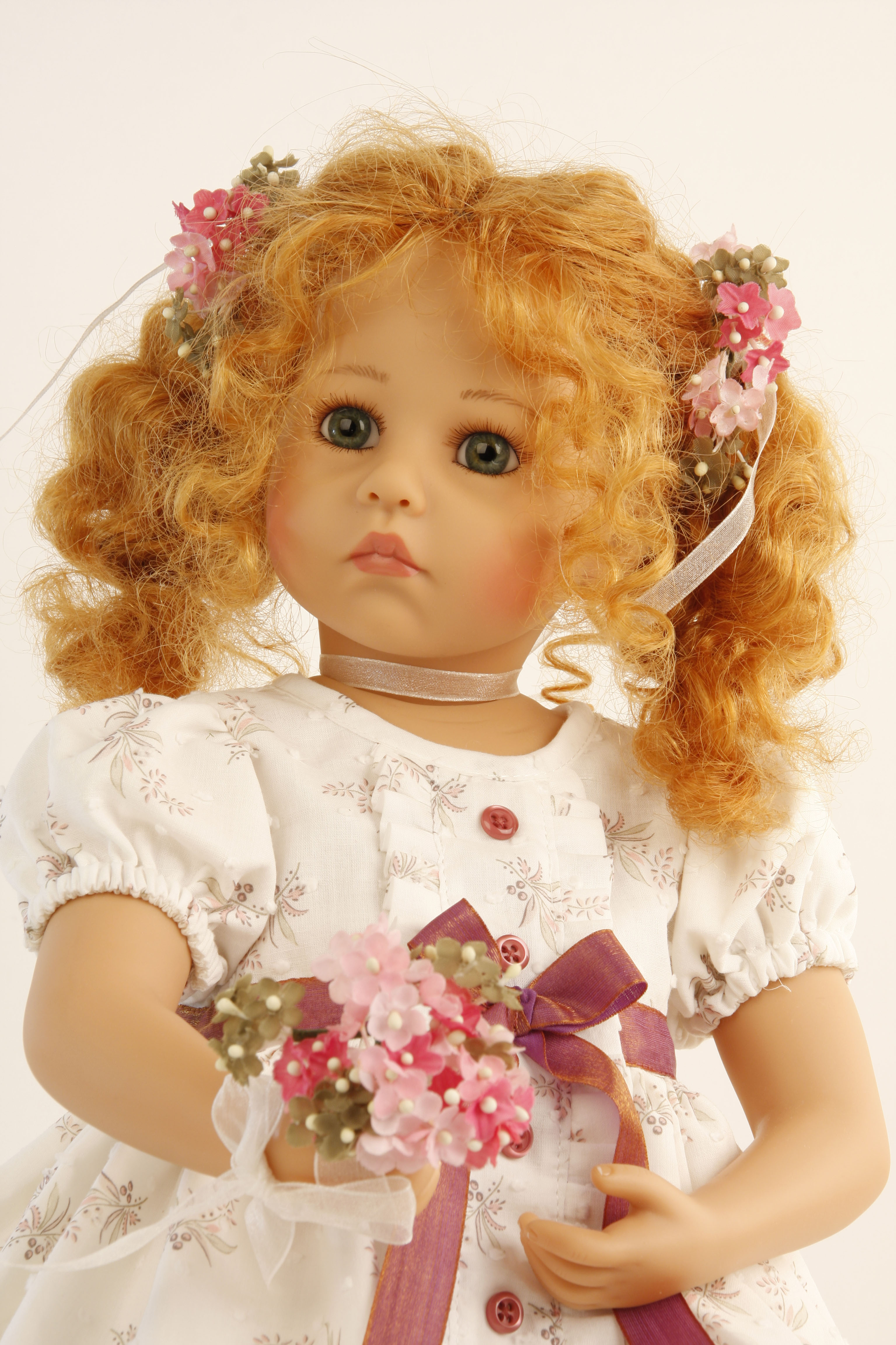 Sybille Sauer ist eine bekannte, deutsche Puppenkünstlerin, die die Liebe zu den Puppen seit Ihrer Kindheit bis heute beibehalten hat. Sie setzt ein schönes Kindergesicht um in eine niedliche Puppe, so entstanden in den letzten 25 Jahren immer wieder faszinierende Puppengeschöpfe. Elena ist ein zartes Puppenkind von Sybille Sauer. Sie hat Arme, angewinkelte Beine und den Kopf aus hochwertigem Hartvinyl. Das Gesicht ist von Hand liebevoll bemalt. Sie trägt eine rote lockige Kannekalonperücke und hat mundgeblasenen,blaue Glasaugen aus Lauscha mit echten Wimpern. Sie hat ein bewegliches Gestell, so das die Puppe sitzen, winken ... kann. Gekleidet ist Elena in eine festliche Blumenkleidung in weiss, sie hat einen Blumenstrauß dabei. Die Puppe ist nicht limitiert. Die Puppe ist in unserer Puppenmanufaktur in Rauenstein gefertigt.