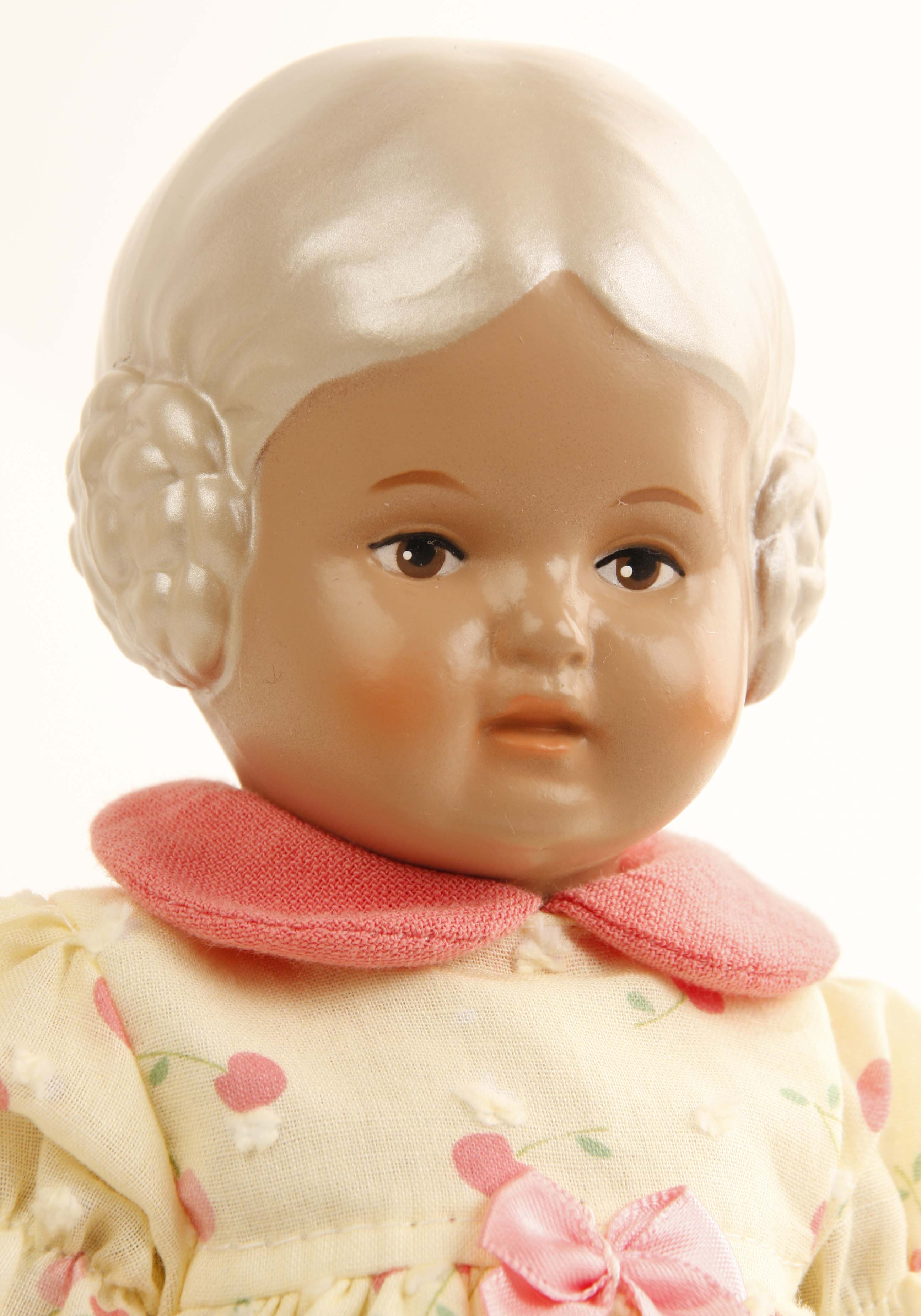 Das erste Mal erblickte Bärbel 1937 das Licht der Puppenwelt, sie gehört zu den 5 bekanntesten Schildkrötpuppen. In Gr. 25 ist die Bärbel ein Kopf-Rumpf-Modell mit Malaugen. Sie trägt ein Sommerkleid in rose/gelb mit Kirschen bedruckt.