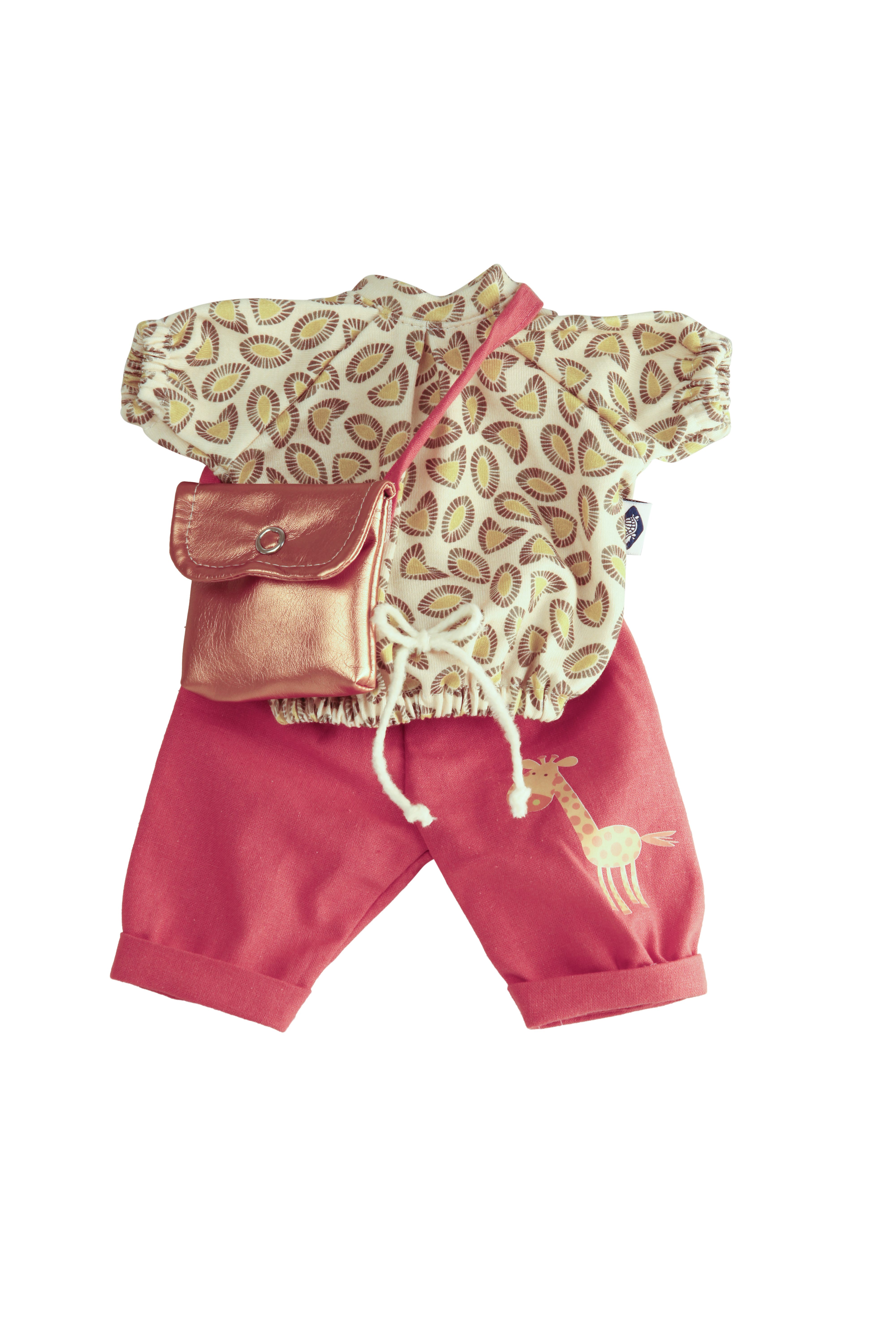 Kleidung Reiselust Gr. 32 für Schlummerle bestehend aus roter Hose mit Giraffenprint, Bluse und Tasche.