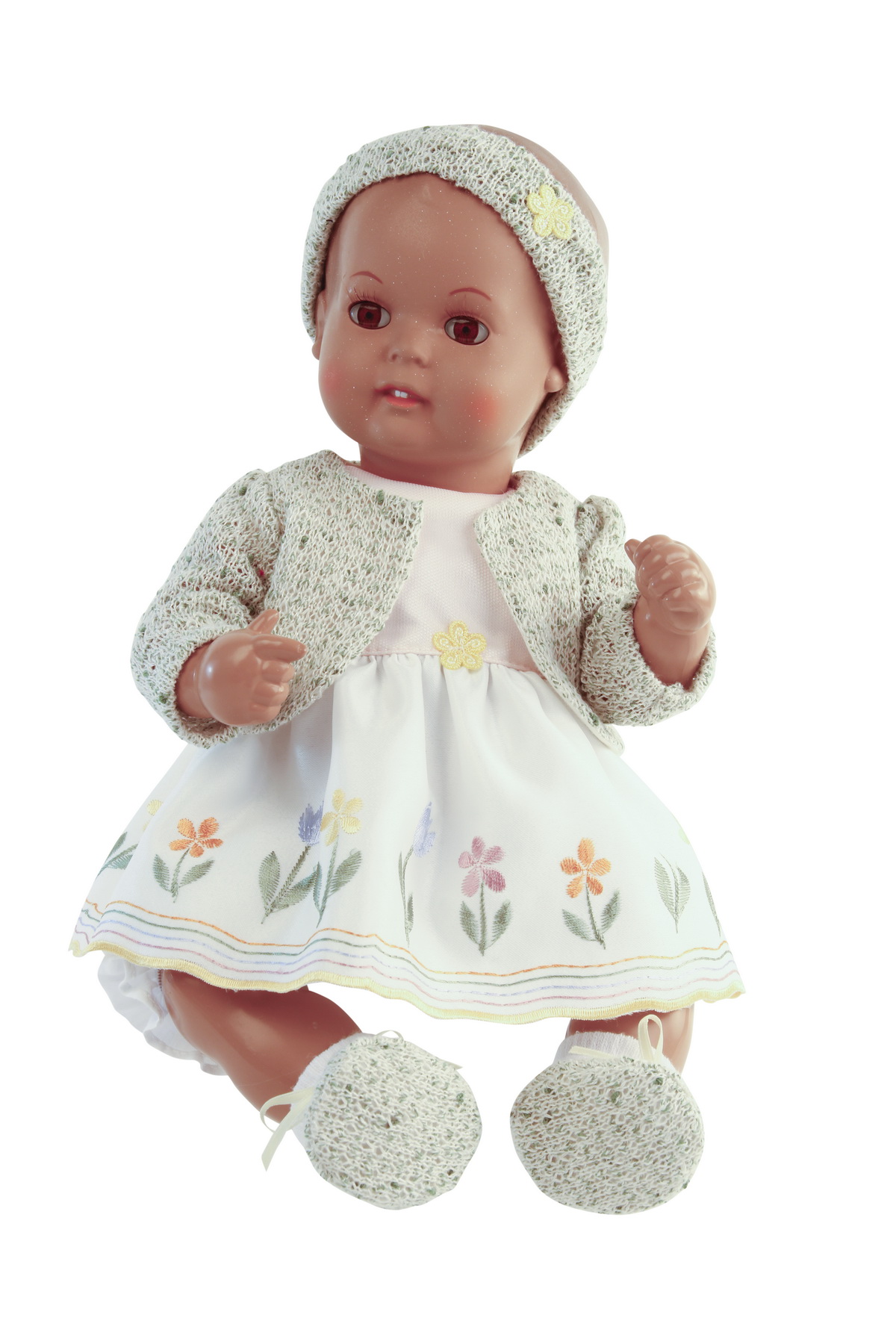 Clothing consisting of a little dress with Plauen embroidery, short bloomers, cardigan, headband and sewn booties.