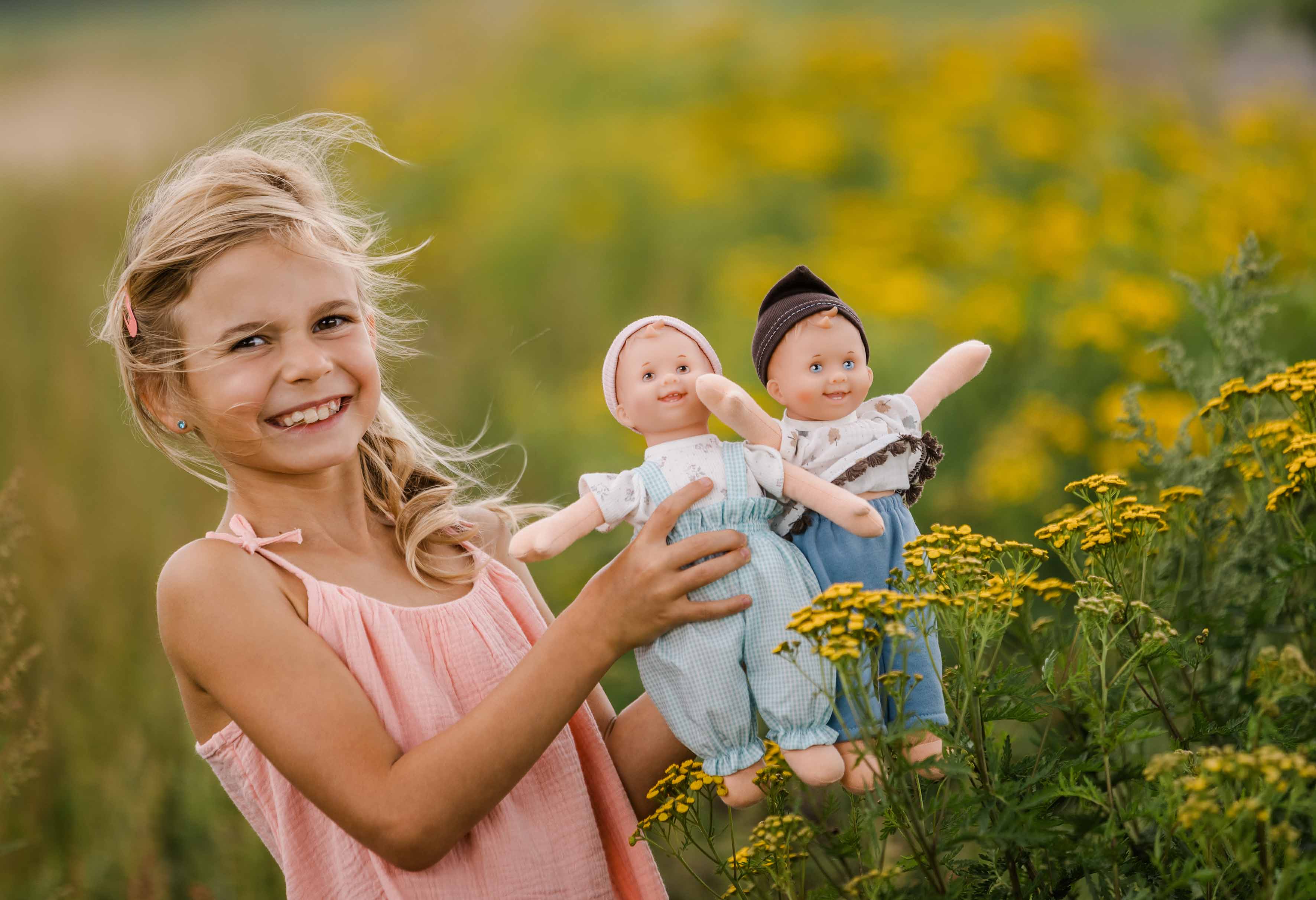 The doll's head is made of vinyl with painted brown eyes and painted hair, Löckchen is made in our own doll manufactory in Rauenstein/Thuringia. The play clothes are easy to put on and take off and are hand washable at 30° C.