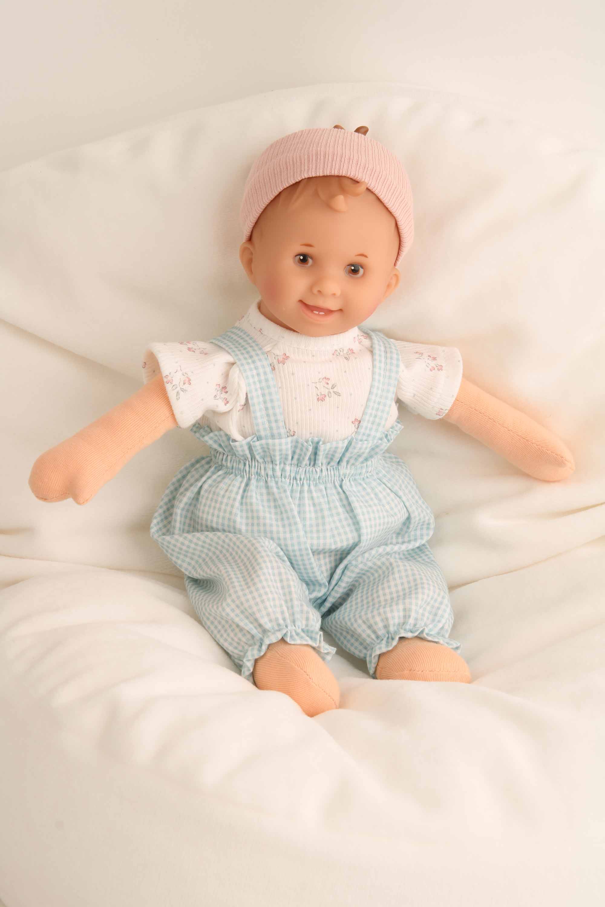 Schmuserle - The perfect doll for our little ones! Every child needs a loyal companion to cuddle and love. Our cuddly toy is just the right doll! With a head made of high-quality vinyl with lovingly painted blue eyes and hair and a soft fabric body, it offers the perfect comfort for little hands. Made in our own doll manufactory in Rauenstein/Thuringia, our cuddly doll stands for quality and craftsmanship. The cute play clothes in blue/creme are easy to put on and take off and can be hand-washed at 30° C - ideal for little adventurers! Suitable for children aged 9 months and over, this little doll will quickly become a best friend and loyal companion in any playroom. Give your child the joy of cuddling and playing with our cuddly toy!
