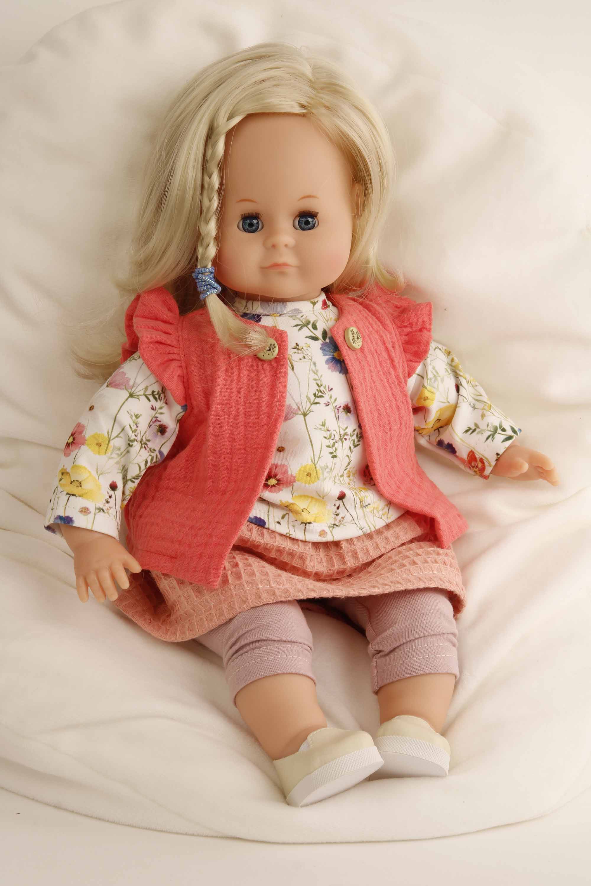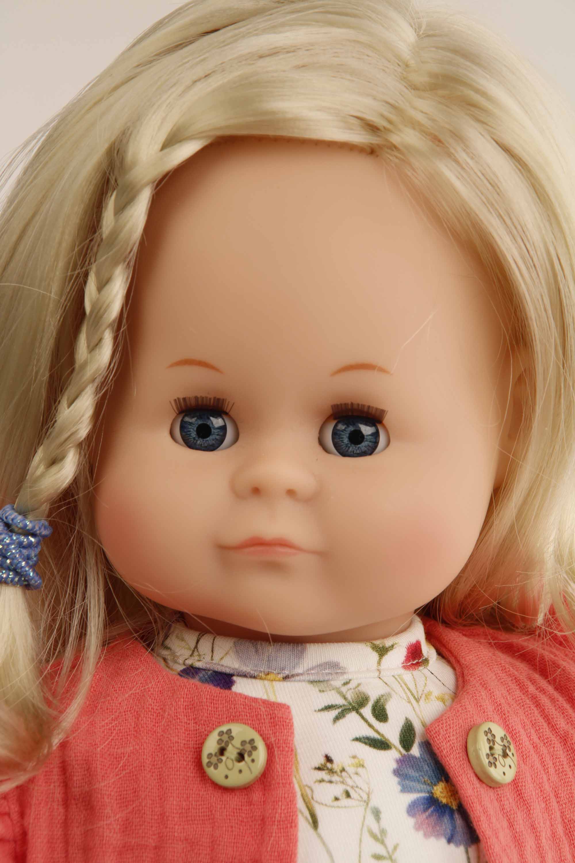Her arms, legs and head are made of vinyl, she has a cuddly soft fabric body, sparkling sleeping eyes and combable, quilted blonde hair. She wears floral print play clothes in rose/lavender/red, which are easy to put on and take off and washable at 30 degrees. The doll is made in Rauenstein/Thuringia.